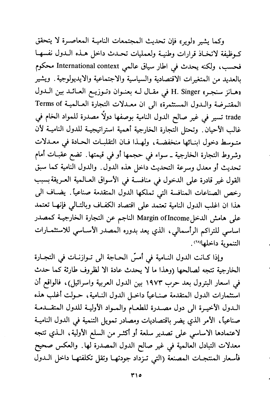 وكما يشير "لوير" فإن تحديث المجتمعات النامية المعاصرة لا يتحقق كوظيفة لاتخاذ قرارات وطنية ولعمليات تحدث داخل هذه الدول نفسها فحسب، ولكنه يحدث في إطار سياق علمي International context محكوم بالعديد من المتغيرات الاقتصادية والسياسية والاجتماعية والإيديولوجية. ويشير "هانز سنجر" H. Singer في مقال له بعنوان توزيع العائد بين الدول المقترضة والدول المستثمرة إلى أن معدلات التجارة العالمية Terms of trade تسير في غير صالح الدول النامية بوصفها دولًا مصدرة للمواد النامية لأن متوسط دخول أبنائها منخفضة، ولهذا فإن التقلبات الحادة في معدلات وشروط التجارة الخارجية -سواء في حجمها أو في قيمتها. تضع عقبات أمام تحديث أو معدل وسرعة التحديث داخل هذه الدول. والدول النامية كما سبق القول غير قادرة على الدخول في منافسة في الأسواق العالمية العريقة بسبب رخص الصناعات المنافسة التي تملكها الدول المتقدمة صناعيًّا. يضاف إلى هذا أن أغلب الدول النامية تعتمد على اقتصاد الكفاف وبالتالي فإنها تعتمد على هامش الدخل Margin of Income الناجم عن التجارة الخارجية كمصدر أساسي للتراكم الرأسمالي، الذي يعد بدوره المصدر الأساسي للاستثمارات التنموية داخلها28.
