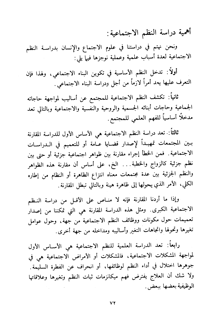 وإذا ما أردنا المقارنة فإنه لا مناص على الأقل من دراسة النظم الاجتماعية الكبرى. ومثل هذه الدراسة المقارنة هي التي تمكننا من إصدار تعميمات حول مكونات ووظائف النظم الاجتماعية من جهة، وحول عوامل تغيرها وتحولها واتجاهات التغير وأساليبه ومداخله من جهة أخرى.