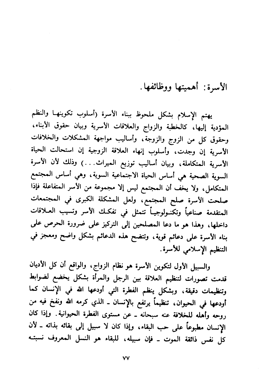 والسبيل الأول لتكوين الأسرة هو نظام الزواج، والواقع أن كل الأديان قدَّمت تصورات لتنظيم العلاقة بين الرجل والمرأة بشكل يخضع لضوابط وتنظيمات دقيقة، وبشكل ينظم الفطرة التي أودعها الله في الإنسان كما أودعها في الحيوان، تنظيماً يرتفع بالإنسان -الذي كرمه الله ونفخ فيه من روحه وأهله للخلافة عنه سبحانه- عن مستوى الفطرة الحيوانية. وإذا كان الإنسان مطبوعاً على حب البقاء، وإذا كان لا سبيل إلى بقائه بذاته -لأن كل نفس ذائقة الموت- فإن سبيله، للبقاء هو النسل المعروف نسبته