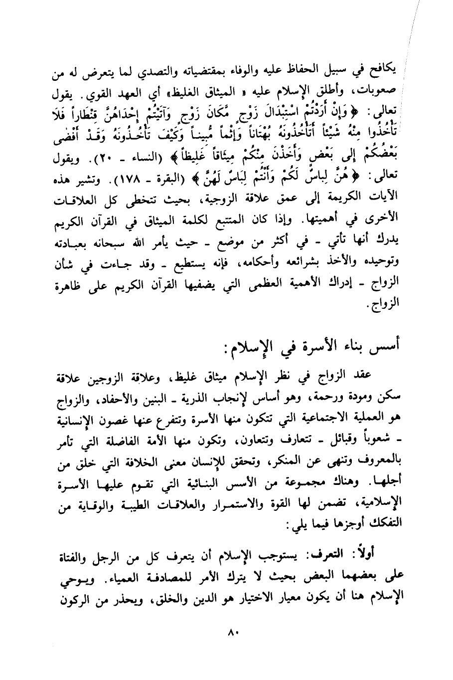 يكافح في سبيل الحفاظ عليه والوفاء بمقتضاياته والتصدي لما يعترض له من صعوبات، وأطلق الإسلام عليه "الميثاق الغليظ" أي العهد القوي. يقول تعالى: {وَإِنْ أَرَدْتُمُ اسْتِبْدَالَ زَوْجٍ مَكَانَ زَوْجٍ وَآتَيْتُمْ إِحْدَاهُنَّ قِنطَاراً فَلا تَأْخُذُوا مِنْهُ شَيْئاً أَتَأْخُذُونَهُ بُهْتَاناً وَإِثْماً مُبِيناً، وَكَيْفَ تَأْخُذُونَهُ وَقَدْ أَفْضَى بَعْضُكُمْ إِلَى بَعْضٍ وَأَخَذْنَ مِنْكُمْ مِيثَاقاً غَلِيظاً} [النساء: 20] . ويقول تعالى: {هُنَّ لِبَاسٌ لَكُمْ وَأَنْتُمْ لِبَاسٌ لَهُن} [البقرة: 178] . وتشير هذه الآيات الكريمة إلى عمق علاقة الزوجية، بحيث تتخطى كل العلاقات الأخرى في أهميتها. وإذا كان المتتبع لكلمة الميثاق في القرآن الكريم يدرك أنها تأتي -في أكثر من موضع- حيث يأمر الله سبحانه بعبادته وتوحيده والأخذ بشرائعه وأحكامه، فإنه يستطيع -وقد جاءت في شأن الزواج- إدراك الأهمية العظمى التي يضفيها القرآن الكريم على ظاهرة الزواج.
