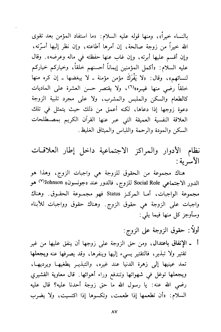 هناك مجموعة من الحقوق للزوجة هي واجبات الزوج، وهذا هو الدور الاجتماعي Social Role للزوج، فالدور عند جونسون7 Johnson هو مجموعة الواجبات، أما المركز Status فهو مجموعة الحقوق. وهناك واجبات على الزوجة هي حقوق الزوج. وهناك حقوق وواجبات للأبناء وسأوجز كل منها فيما يلي: