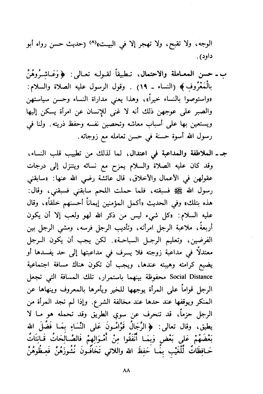ج- الملاطفة والمداعبة في اعتدال: لما لذلك من تطييب قلب النساء، وقد كان عليه الصلاة والسلام يمزح مع نسائه ويتنزل إلى درجات عقولهن في الأعمال والأخلاق، قالت عائشة رضي الله عنها: سابقني رسول الله صلي الله عليه وسلم فسبقته، فلما حملت اللحم سابقني فسبقني، وقال: "هذه بتلك" وفي الحديث: "أكمل المؤمنين إيمانًا أحسنهم خلقًا" وقال عليه السلام: "كل شيء ليس من ذكر الله لهوٌ ولعب إلا أن يكون أربعة، ملاعبة الرجل امرأته، وتأديب الرجل فرسه، ومشي الرجل بين الفرضين، وتعليم الرجل السباحة". لكن يجب أن يكون الرجل معتدلًا في مداعبة زوجته فلا يسرف في مداعبتها إلى حد يفسدها أو يضيع كرامته وهيبته عندها، ويجب أن تكون هناك مسافة اجتماعية Social Distance محفوظة بينهما باستمرار، تلك المسافة التي تجعل الرجل قوامًا على المرأة يوجهها للخير ويأمرها بالمعروف وينهاها عن المنكر ويوقفها عند حدها عند مخالفة الشرع. وإذا لم تجد مخالفة الشرع. وإذا لم تجدِ المْرَأة من الرجل حزماً، قد تنحرف عن سوي الطريق وقد تحمله هو ما لا يطيق، وقال تعالى: {الرِّجَالُ قَوَّامُونَ عَلَى النِّسَاءِ بِمَا فَضَّلَ اللَّهُ بَعْضَهُمْ عَلَى بَعْضٍ وَبِمَا أَنفَقُوا مِنْ أَمْوَالِهِمْ فَالصَّالِحَاتُ قَانِتَاتٌ حَافِظَاتٌ لِلْغَيْبِ بِمَا حَفِظَ اللَّهُ وَاللاَّتِي تَخَافُونَ نُشُوزَهُنَّ فَعِظُوهُنَّ