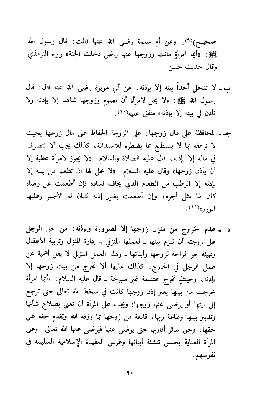 د- عدم الخروج من منزل زوجها إلا لضرورة وبإذنه: من حق الرجل على زوجته أن تلزم بيتها -لعملها المنزلي- إدارة المنزل وتربية الأطفال وتهيئة جو الراحة لزوجها وأبنائها -وهذا العمل المنزلي لا يقل أهمية عن عمل الرجل في الخارج. كذلك عليها ألا تخرج من بيت زوجها إلا بإذنه، وحينئذ تخرج محتشمة غير متبرجة- قال عليه السلام: "أيَّما امرأة خرجتْ من بيتها بغير إذن زوجها كانت في سخط الله تعالى حتى ترجع إلى بيتها أو يرضى عنها زوجها" ويجب على المرأة أن تعنى بصلاح شأنها وتدبير بيتها وطاعة ربها، قانعة من زوجها بما رزقه الله وتقدم حقه على حقها، وحق سائر أقاربها حتى يرضى عنها فيرضى عنها الله تعالى. وعلى المرأة العناية بحسن تنشئة أبنائها وغرس العقيدة الإسلامية السليمة في نفوسهم.