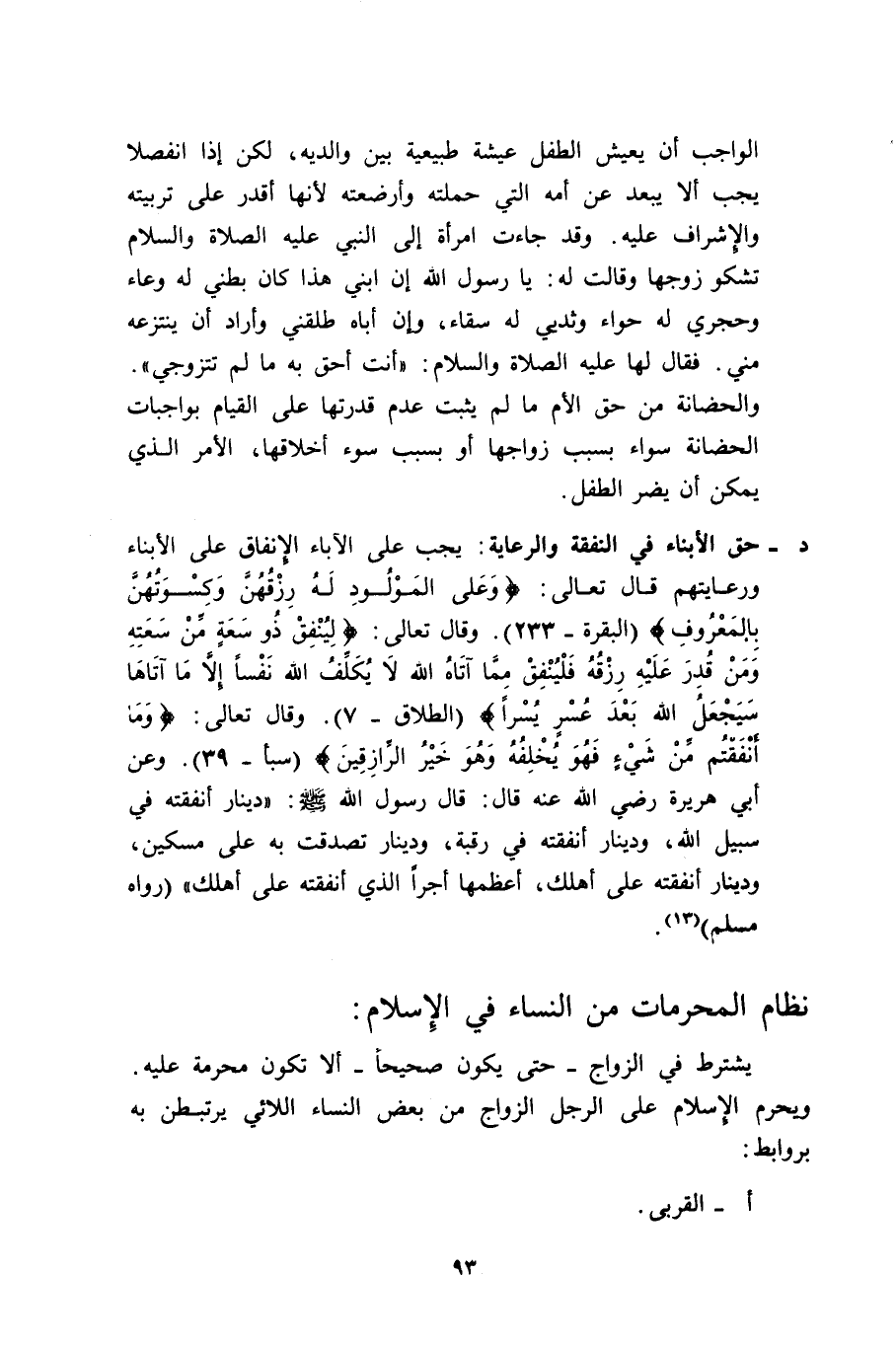 الواجب أن يعيش الطفل عيشة طبيعية بين والديه، لكن إذا انفصلا يجب ألا يبعد عن أمه التي حملته وأرضعته لأنها أقدر على تربيته والإشراف عليه. وقد جاءت امرأة إلى النبي -عليه الصلاة والسلام- تشكو زوجها وقالت له: يا رسول الله إن ابني هذا كان بطني له وعاء وحجري له حواء وثديي له سقاء، وإن أباه طلقني وأراد أن ينتزعه مني. فقال لها عليه الصلاة والسلام: "أنت أحق به ما لم تتزوجي". والحضانة من حق الأم ما لم يثبت عدم قدرتها على القيام بواجبات الحضانة سواء بسبب زواجها أو بسبب سوء أخلاقها، الأمر الذي يمكن أن يضر الطفل.