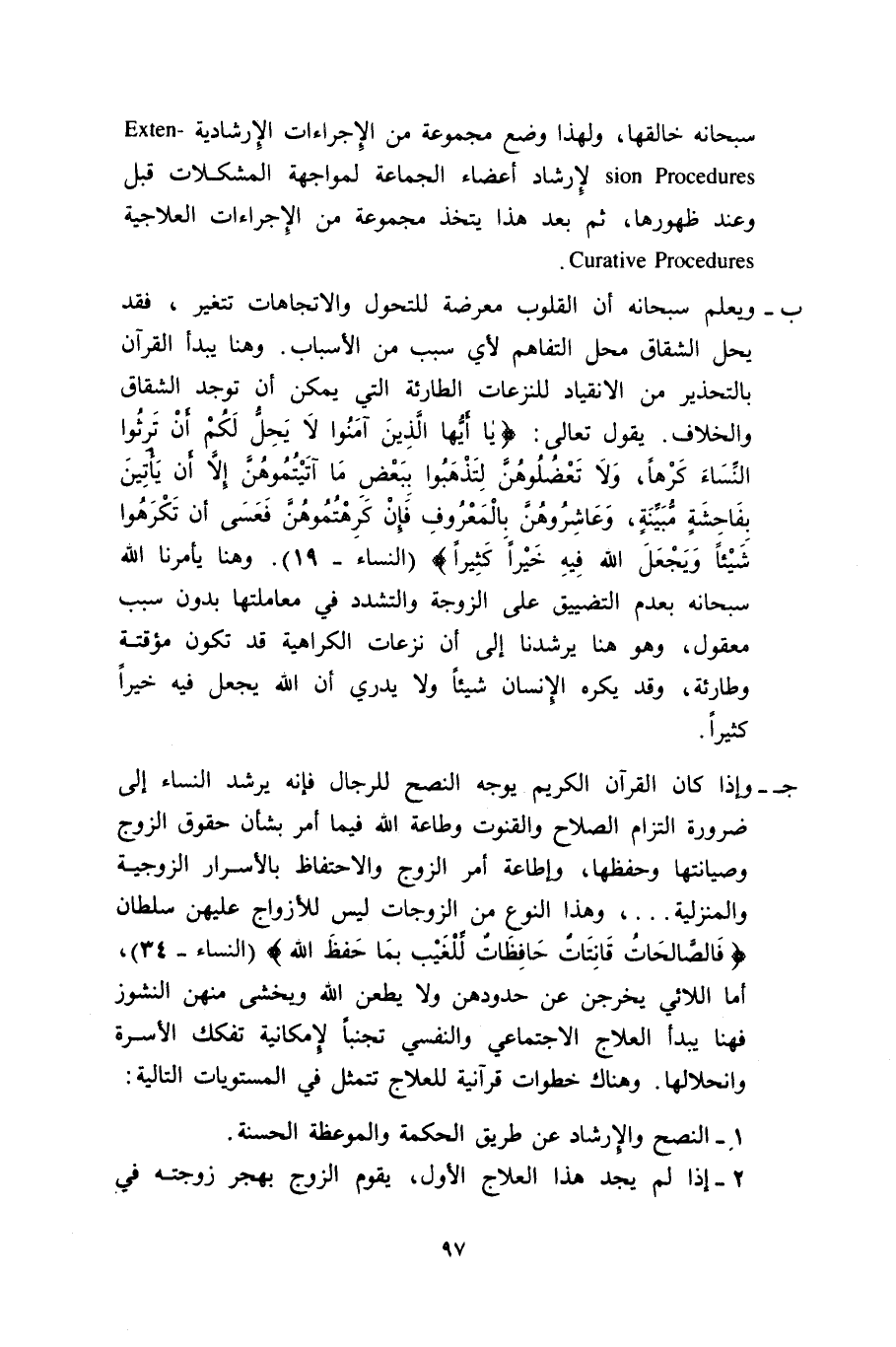 ج- وإذا كان القرآن الكريم يوجه النصح للرجال فإنه يرشد النساء إلى ضرورة التزام الصلاح والقنوت وطاعة الله فيما أمر بشأن حقوق الزوج وصيانتها وحفظها، وإطاعة أمر الزوج والاحتفاظ بالأسرار الزوجية والمنزلية، وهذا النوع من الزوجات ليس للأزواج عليهن سلطان {فَالصَّالِحَاتُ قَانِتَاتٌ حَافِظَاتٌ لِلْغَيْبِ بِمَا حَفِظَ اللَّهُ} [النساء: 34] ، أما اللائي يخرجن عن حدودهن ولا يطعن الله ويخشى منهن النشوز فهنا يبدأ العلاج الاجتماعي والنفسي تجنباً لإمكانية تفكك الأسرة وانحلالها. وهناك خطوات قرآنية للعلاج تتمثل في المستويات التالية: