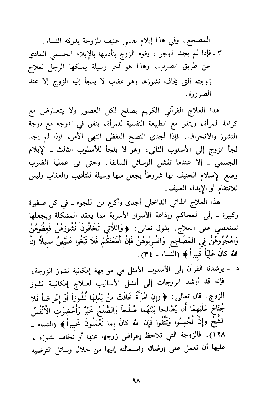 هذا العلاج القرآني الكريم يصلح لكل العصور ولا يتعارض مع كرامة المرأة، ويتفق مع الطبيعة النفسية للمرأة، يتفق في تدرجه مع درجة النشوز والانحراف، فإذا أجدى النصح اللفظي انتهى الأمر، فإذا لم يجد لجأ الزوج إلى الأسلوب الثاني، وهو لا يلجأ للأسلوب الثالث -الإيلام الجسمي- إلا عندما تفشل الوسائل السابقة. وحتى في عملية الضرب وضع الإسلام الحنيف لها شروطاً يجعل منها وسيلة للتأديب والعقاب وليس للانتقام أو الإيذاء العنيف.