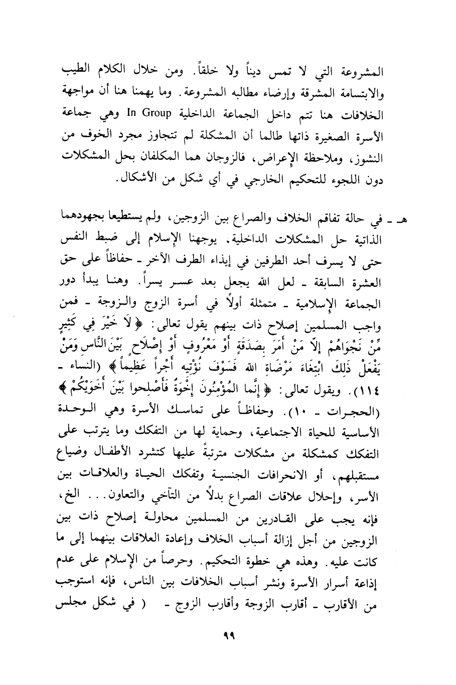 هـ- في حالة تفاقم الخلاف والصراع بين الزوجين، ولم يستطيعا بجهودهما الذاتية حل المشكلات الداخلية. يوجهنا الإسلام إلى ضبط النفس حتى لا يسرف أحد الطرفين في إيذاء الطرف الآخر -حفاظاً على حق العشرة السابقة- لعل الله يجعل بعد عسر يسراً. وهنا يبدأ دور الجماعة الإسلامية- متمثلة أولاً في أسرة الزوج والزوجة- فمن واجب المسلمين إصلاح ذات بينهم يقول تعالى: {لا خَيْرَ فِي كَثِيرٍ مِنْ نَجْوَاهُمْ إِلاَّ مَنْ أَمَرَ بِصَدَقَةٍ أَوْ مَعْرُوفٍ أَوْ إِصْلاحٍ بَيْنَ النَّاسِ وَمَنْ يَفْعَلْ ذَلِكَ ابْتِغَاءَ مَرْضَاةِ اللَّهِ فَسَوْفَ نُؤْتِيهِ أَجْراً عَظِيماً} [النساء: 114] . ويقول تعالى: {إِنَّمَا الْمُؤْمِنُونَ إِخْوَةٌ فَأَصْلِحُوا بَيْنَ أَخَوَيْكُمْ} [الحجرات: 10] . وحفاظاً على تماسك الأسرة وهي الوحدة الأساسية للحياة الاجتماعية، وحماية لها من التفكك وما يترتب على التفكك كمشكلة من مشكلات مترتبة عليها كتشرد الأطفال وضياع مستقبلهم، أو الانحرافات الجنسية وتفكك الحياة والعلاقات بين الأسر، وإحلال علاقات الصراع بدلاً من التآخي والتعاون ... إلخ، فإنه يجب على القادرين من المسلمين محاولة إصلاح ذات بين الزوجين من أجل إزالة أسباب الخلاف وإعادة العلاقات بينهما إلى ما كانت عليه. وهذه هي خطوة التحكيم. حرصاً من الإسلام على عدم إذاعة أسرار الأسرة ونشر أسباب الخلافات بين الناس، فإنه استوجب من الأقارب -أقارب الزوجة وأقارب الزوج- في شكل مجلس