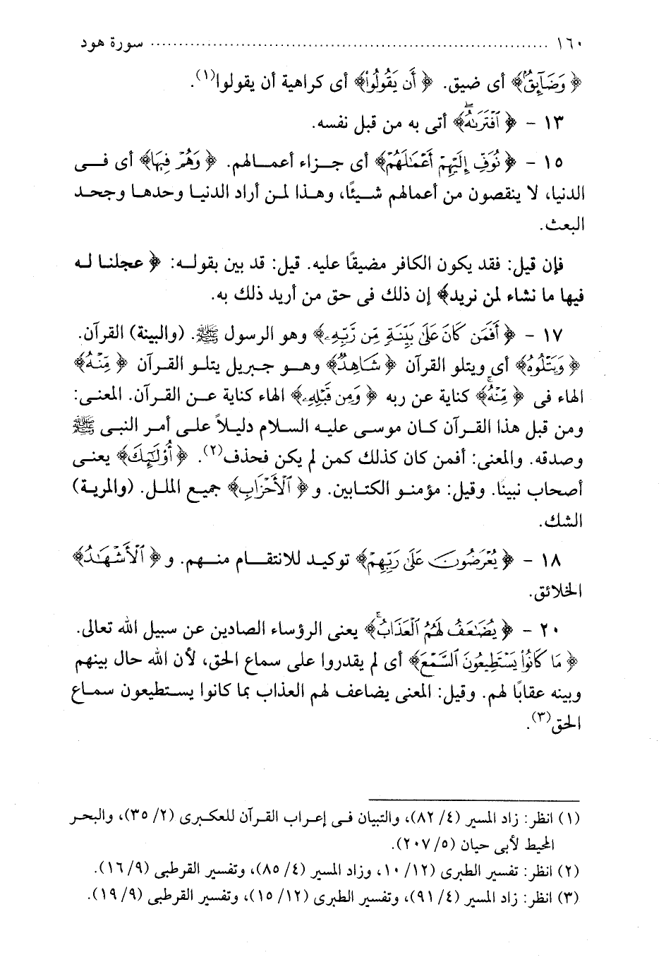 {أفمن كان على بينة من ربه} وهو الرسول صلى الله عليه وسلم والبينة القران {ويتلوه} أي ويتلوا القران {شاهد} وهو جبريل يتلوا القرا {منه} الهاء في {منه} كناية عن ربه {ومن قبله} الهاء كناية عن القران المعنى ومن قبل هذا القران كان موسى عليه السلام دليلا على امر النبي صلى الله عليه وسلم وصدقه والمعنى افمن كان كذلك كمن لمن يكن فحذف