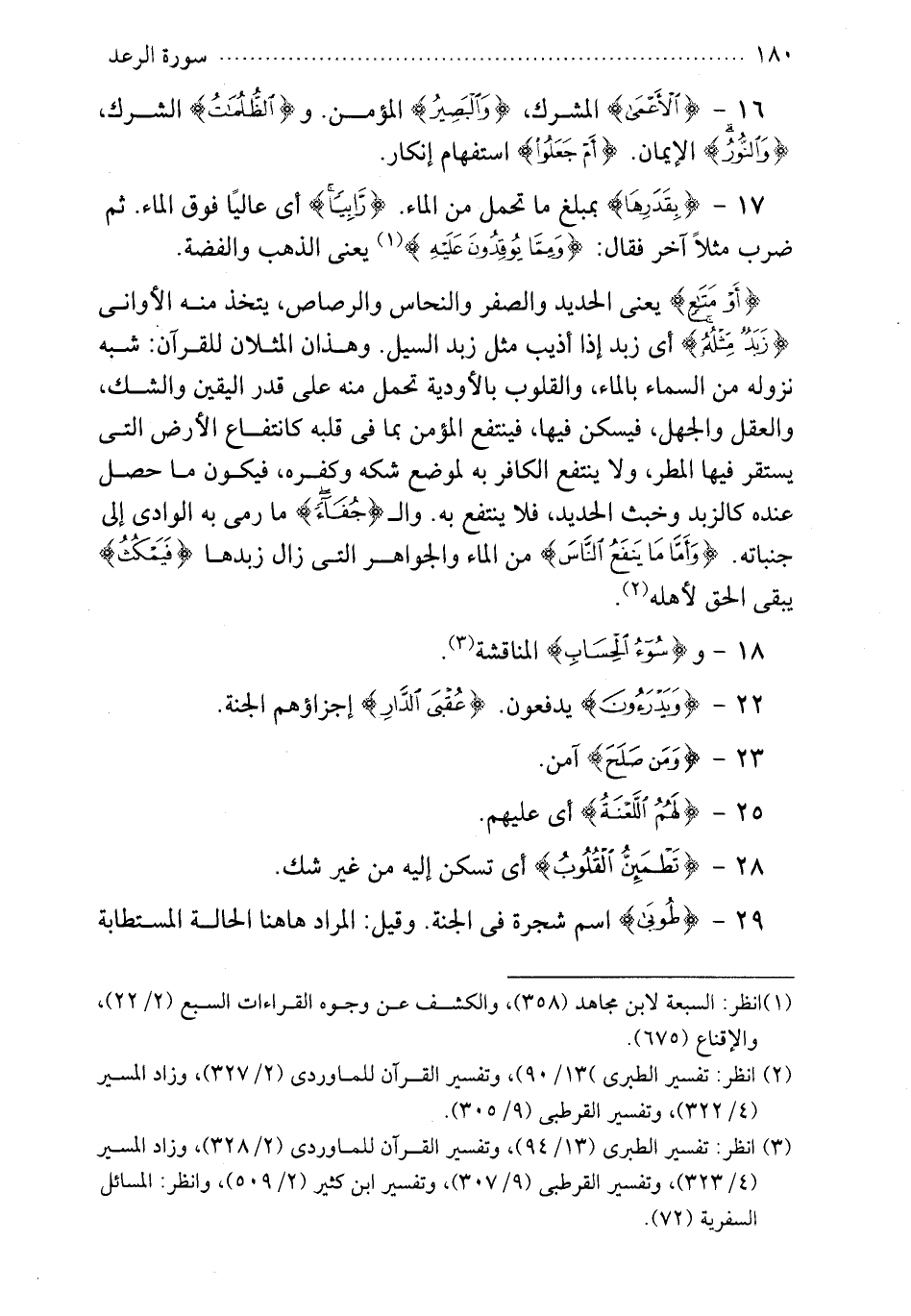 {أو متاع} يعني الحديد والصفر والنحاس والرصاص يتخذ منه الاواني {زبد مثله} أي زبد اذا أذيب مثل زبد السيل وهذان المثلان للقران شبه نزوله من السماء بالماء والقلوب بالاوديه تحمل منه على قدر اليقين والشك والعقل والجهل فيسكن فيها فينتفع المؤمن بما في قلبه كانتفاع الارض التي يستقر فيها المطر ولا ينتفع الكافر به لموضع شكه وكفره فيكون ما حصل عنده كالزبد وخبث الحديد فلا ينتفع به والجفاء ما رمى به الوادي الى جنباته {وأما ما ينفع الناس} من الماء والجواهر التي زال زبدها {فيمكث} يبقى الحق لاهله