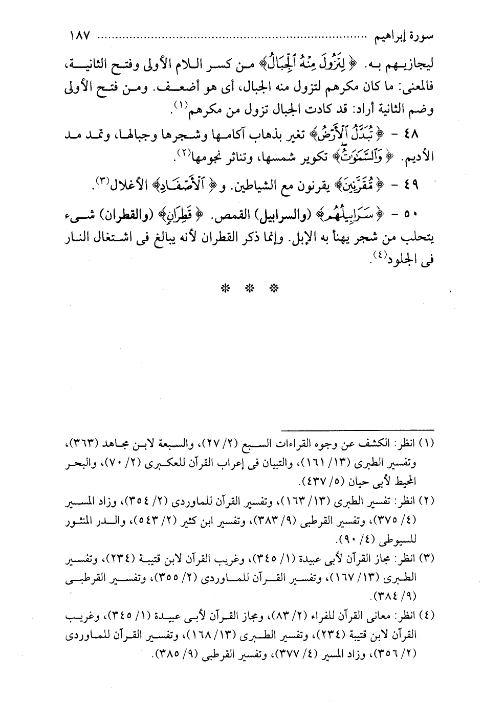 والسرابيل القمص والقطران شيء يتحلب من شجر يهنأ به الابل وانما ذكر القطران لانه يبالغ في اشتغال النار في الجلود