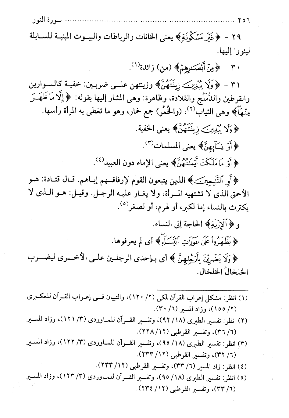 31 - {ولا يبدين زينتهن} وزينتهن على ضربين خفية كالسوارين والقرمطين والدملج والقلادة وظاهرة وهي المشار إليها بقوله {إلا ما ظهر منها} وهي الثياب والخمر جمع خمار وهو ما تغطى به المرأة رأسها