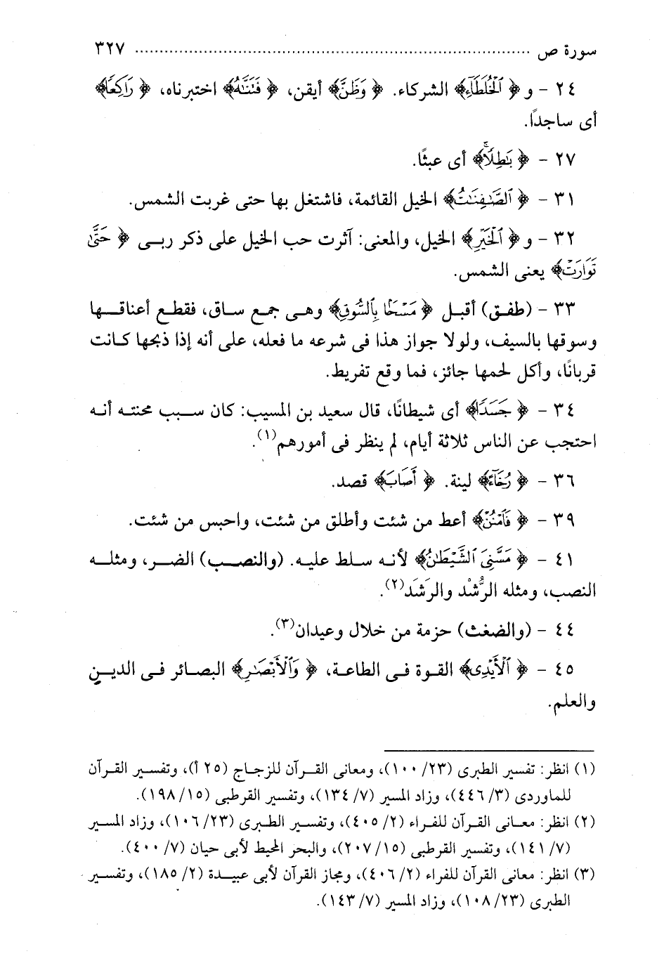 33 - طفق أقبل {مسحا بالسوق} وهي جمع ساق فقطع أعناقها وسوقها بالسيف ولولا جواز هذا في شرعه ما فعله على أنه إذا ذبحها كانت قربانا وأكل لحمها جائز فما وقع تفريط
