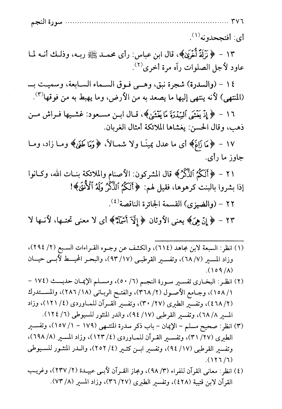 16 - {إذ يغشى السدرة ما يغشى} قال ابن مسعود غشيها فراش من ذهب وقال الحسن يغشاها الملاذكة أمثال الغربان