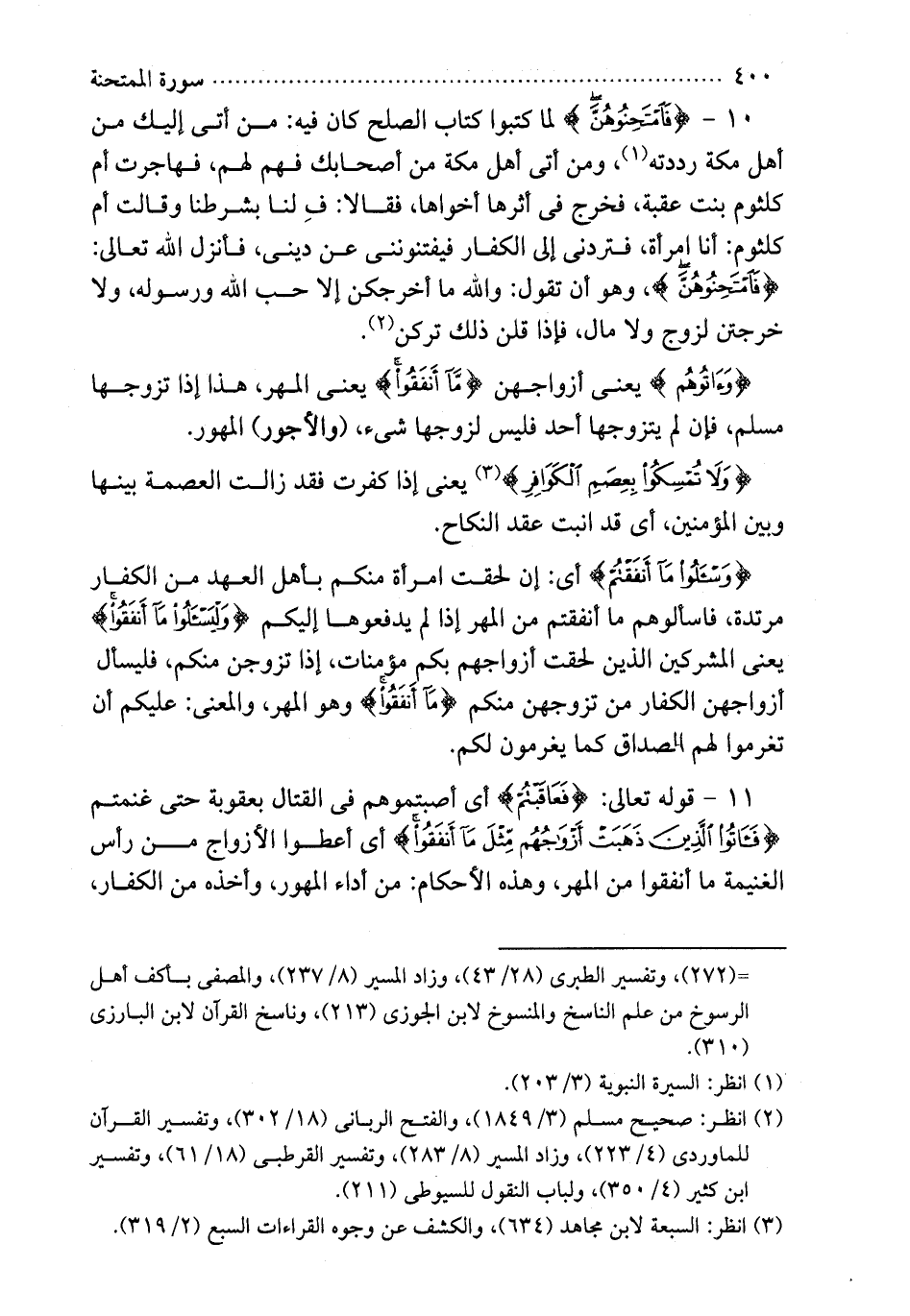 10 - {فامتحنوهن} لما كتبوا كتاب الصلح كان فيه من أتى إليك من أهل مكة رددته ومن أتى أهل مكة من أصحابك فهم لهم فهاجرت أم كلثوم بنت عقبة فخرج في أثرها أخواها فقالا ف لنا بشرطنا وقالت أم كلثوم أنا امرأة فتردني إلى الكفار فيفتنونني عن ديني فأنرل الله تعالى {فامتحنوهن} وهو أن تقول والله ما أخرجكن رلا حب الله ورسوله ولا خرجتن ازوج ولا مال فرذا قلن ذلك تركن