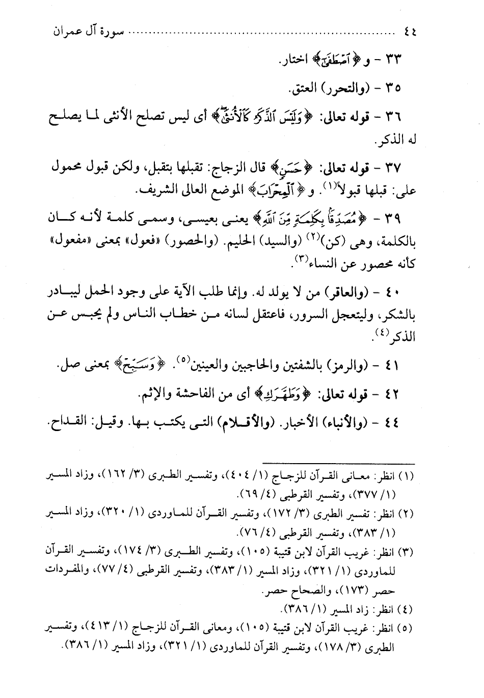 {مصدقا بكلمة من الله} يعني بعيسى وسمي كلمة لانه كان بالكلمه وهي كن والسيد الحليم والمحصور فعول بمعنى مفعول كانه محصور عن النساء