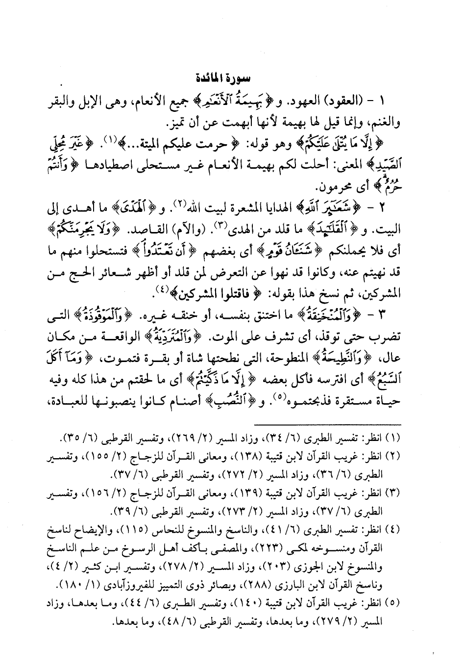 {والموقوذة} التي تضرب حتى توقظ أي تشرف على الموت {والمتردية} الواقعة من مكان عال {والنطيحة} المنطوحة التي نطحتها شاة او بقرة فتموت {وما أكل السبع} أي افترسه فاكل بعضه {إلا ما ذكيتم} أي ما لحقتم من هذا كله وفيه حياة مستقرة فذبحتموه