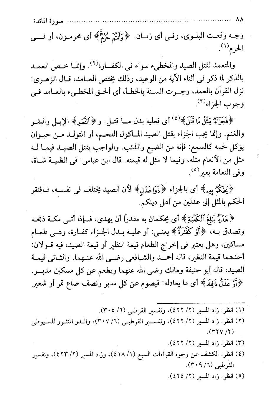 مكه ذبحه وتصق به {أو كفارة} يعني او عليه بدل الجزا كفارة وهي طعام مساكين وهل يعتبر في اخراج الطعام قيمة النظير او قيمة الصيد فيه قولان احدهما قيمة النظير قال احمد والشافعي رضي الله عنهما والثاني قيمة الصيد قاله ابو حنيفه ومالك رضي الله عنهما ويطعم عن كل مسكين مدبر {أو عدل ذلك} أي ما يعادله فيصوم عن كل مدبر ونصف صاع تمر او شعير