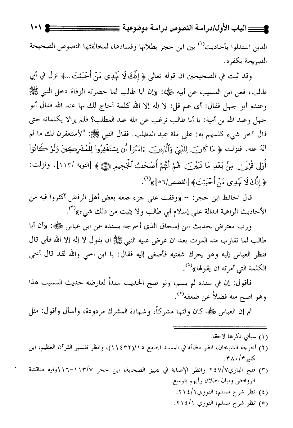 ورب معترض بحديث إبن اسحق الذي أخرجه بسنده عن إبن عباس - رضي الله عنه -: ((أن ابا طالب لما تقارب منه الموت بعد ان عرض عليه النبي - صلى الله عليه وسلم - ان يقول لا اله إلا الله فابى قال فنظر العباس اليه وهو يحرك شفتيه فاصغى اليه فقال: يا إبن اخي والله لقد قال أخي الكلمة التي امرته ان يقولها)) (¬6).