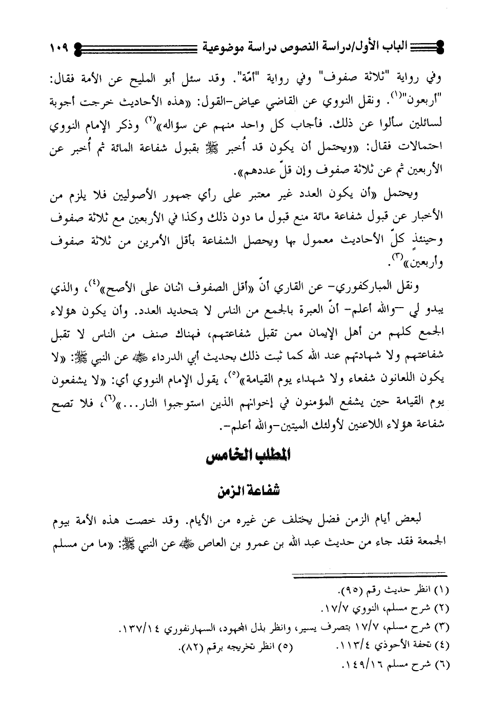 وفي رواية "ثلاثة صفوف" وفي رواية "أمّة". وقد سئل أبو المليح عن الأمة فقال: "اربعون" (¬1). ونقل النووي عن القاضي عياض-القول: ((هذه الأحاديث خرجت أجوبة لسائلين سألوا عن ذلك. فأجاب كل واحد منهم عن سؤاله)) (¬2) وذكر الإمام النووي احتمالات فقال: ((ويحتمل أن يكون قد أُخبر - صلى الله عليه وسلم - بقبول شفاعة المئة ثم أُخبر عن الأربعين ثم عن ثلاثة صفوف وإن قلّ عددهم)).