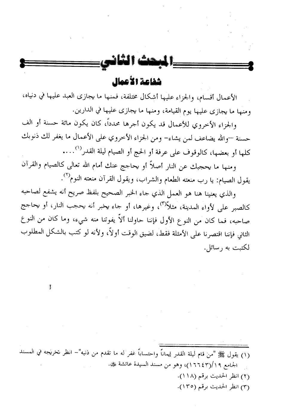 والذي يعنينا هنا هو العمل الذي جاء الخبر الصحيح بلفظ صريح أنه يشفع لصاحبه كالصبر على الأواء المدينة، مثلاً (¬3)، وغيرها، أو جاء يخبر أنه يحجب النار، أو يحاجج صاحبه، فما كان من النوع الأول فأننا حاولنا الا يفوتنا منه شيء، وما كان من النوع الثاني فاننا اقتصرت على الامثلة فقط، لضيق الوقت أولاً، ولأنه لو كتب بالشكل المطلوب لكتبت به رسائل.