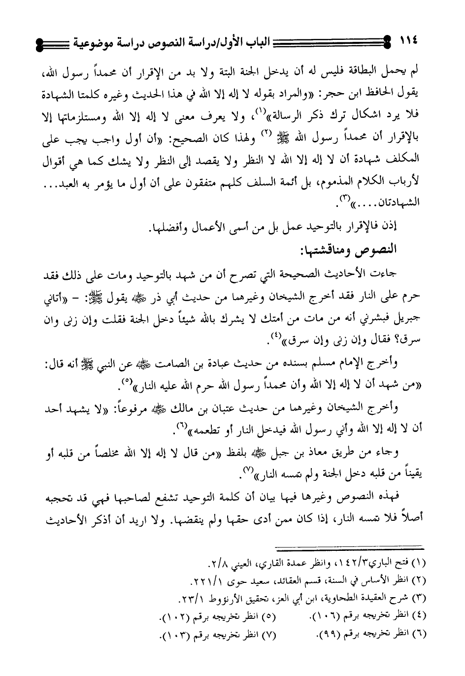لم يحمل البطاقة فليس له أن يدخل الجنة البتة ولابد من الإقرار أن محمداً رسول الله، يقول الحافظ أبن حجر: ((والمراد بقوله لا اله إلا الله في هذا الحديث وغيره كلمتا الشهادة فلا يرد أشكال ترك ذكر الرسالة)) (¬1)، ولا يعرف معنى لا اله إلا الله ومستلزماتها إلا بالإقرار أن محمداً رسول الله - صلى الله عليه وسلم - (¬2) ولهذا كان الصحيح: ((أن أول واجب يجب على المكلف شهادة أن لا اله إلا الله لا النظر ولا يقصد إلى النظر ولا يشك كما هي أقوال لأرباب الكلام المذموم، بل أئمة السلف كلهم متفقون على أن أول ما يؤمر به العبد ... الشهادتان ... .)) (¬3).