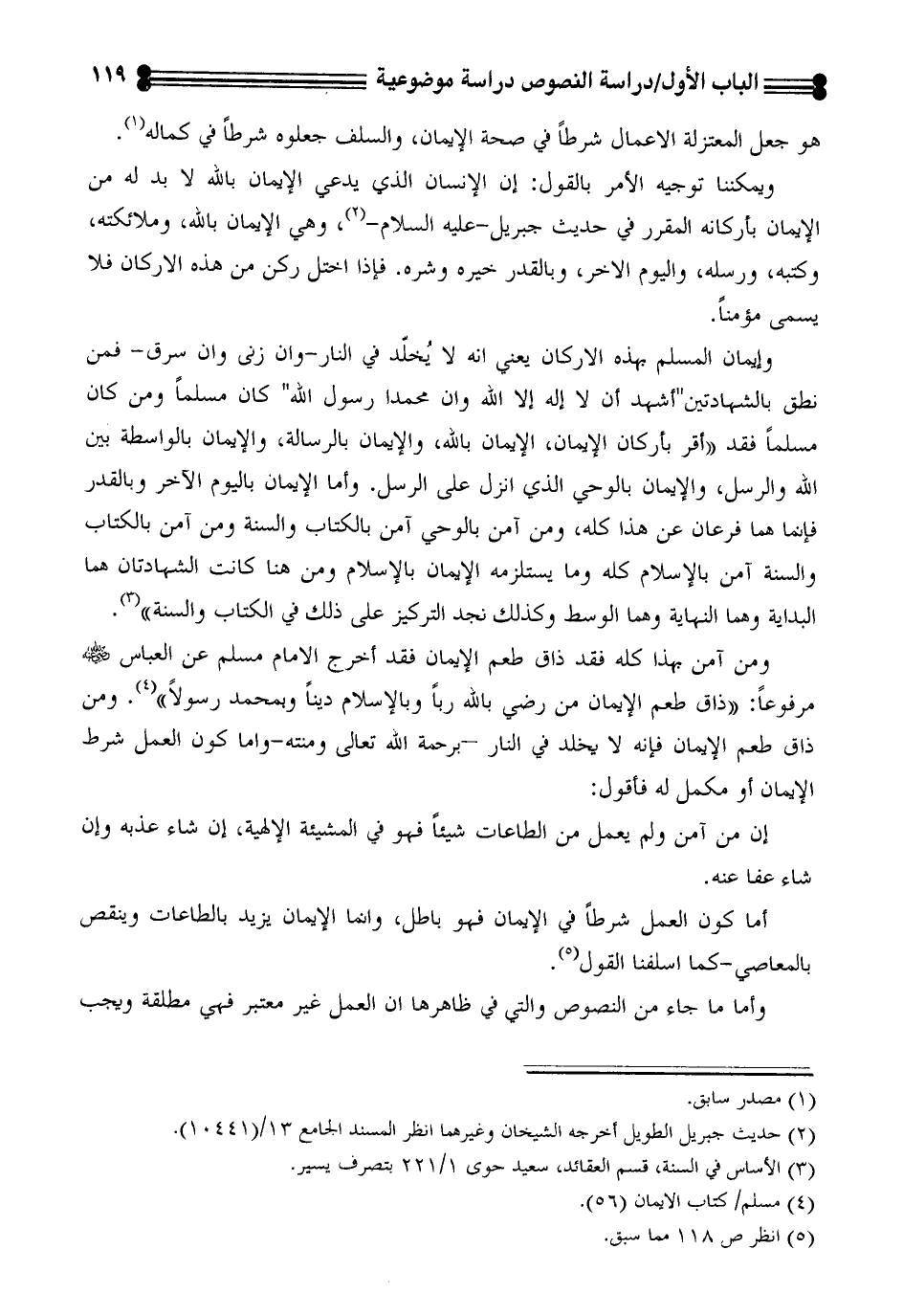ويمكننا توجيه الامر بالقول: إن الانسان الذي يدعي الايمان بالله لا بد له من الايمان باركانه المقرر في حديث جبريل-عليه السلام- (¬2)، وهي الايمان بالله، وملائكته، وكتبه، ورسله، واليوم الاخر، وبالقدر خير وشره. فاذا اختل ركن من هذه الاركان فلا يسمى مؤمناً.
