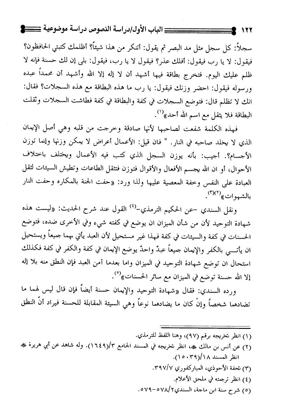 ونقل السندي-عن الحكيم الترمذي- (¬4) القول عند شرح الحديث: ((ليست هذه شهادة التوحيد لان من شأن الميزان ان يوضع في كفته شيء وفي الأخرى ضده، فتوضع الحسنات في كفة والسيئات في كفة فهذا غير مستحيل لأن العبد ياتي بهما جميعاً ويستحيل ان يأتي بالكفر والإيمان جميعاً عبدٌ واحدٌ يوضع الإيمان في كفة والكفر في كفة فكذلك استحال ان توضع شهادة التوحيد في الميزان واما بعدما آمن العبد فإن النطق منه بلا اله إلا الله حسنة توضع في الميزان مع سائر الحسنات)) (¬5).