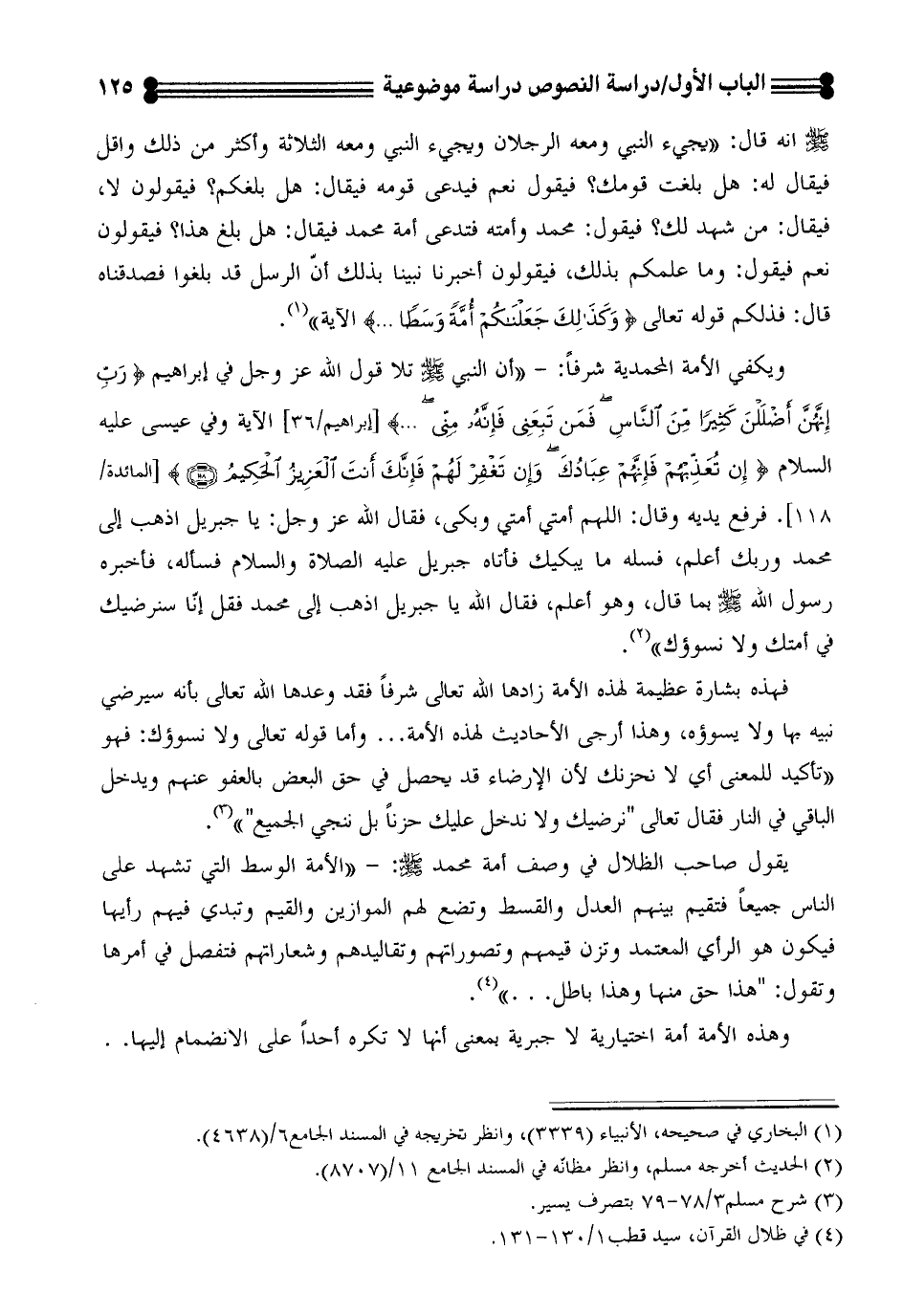 - صلى الله عليه وسلم - انه قال: ((يجيء النبي ومعه الرجلان ويجيء النبي ومعه الثلاث واكثر من ذلك واقل فيقال له: هل بلغت قومك؟ فيقول نعم فيدعي قومه فيقال: هل بلغكم؟ فيقولون لا، فيقال: من شهد لك؟ فيقول: محمد وأمته فتدعى أمة محمد فيقال: هل بلغ هذا؟ فيقولون نعم فيقول: وما علمكم بذلك، فيقولون أخبرنا نبينا بذلك أنّ الرسل قد بلغوا فصدقناه قال: فذلكم قوله تعالى "وكذلك جعلناكم أمة وسطاً ... " الآية)) (¬1).