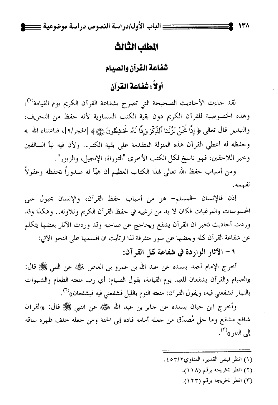 لقد جاءت الأحاديث الصحيحة التي تصرح بشفاعة القرآن الكريم يوم القيامة (¬1)، وهذه الخصوصية للقرآن الكريم دون بقية الكتب السماوية لانه حفظ من التحريف، والتبديل قال تعالى ((إنا نحن نزلنا الذكر وإنا له لحافظون)) (¬2)، فباعتناء الله به وحفظه له أعطي القرآن هذه المنزلة المتقدمة على بقية الكتب. ولان فيه نبأ السالفين وخبر اللاحقين، فهو ناسخ لكل الكتب الأخرى "التوراة، الانجيل، والزبور".
