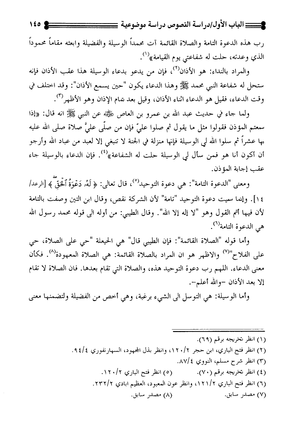 ومعنى "الدعوة التامة": هي دعوة التوحيد (¬5)، قال تعالى "له دعوة الحق" (¬6). وإنما سميت دعوة التوحيد "تامة" لان الشركة نقص، وقال إبن التين وصفت بالتامة لان فيها اتم القول وهو "لا اله الا الله". وقال الطيبي: من اوله الى قوله محمد رسول الله هي الدعوة التامة (¬7).