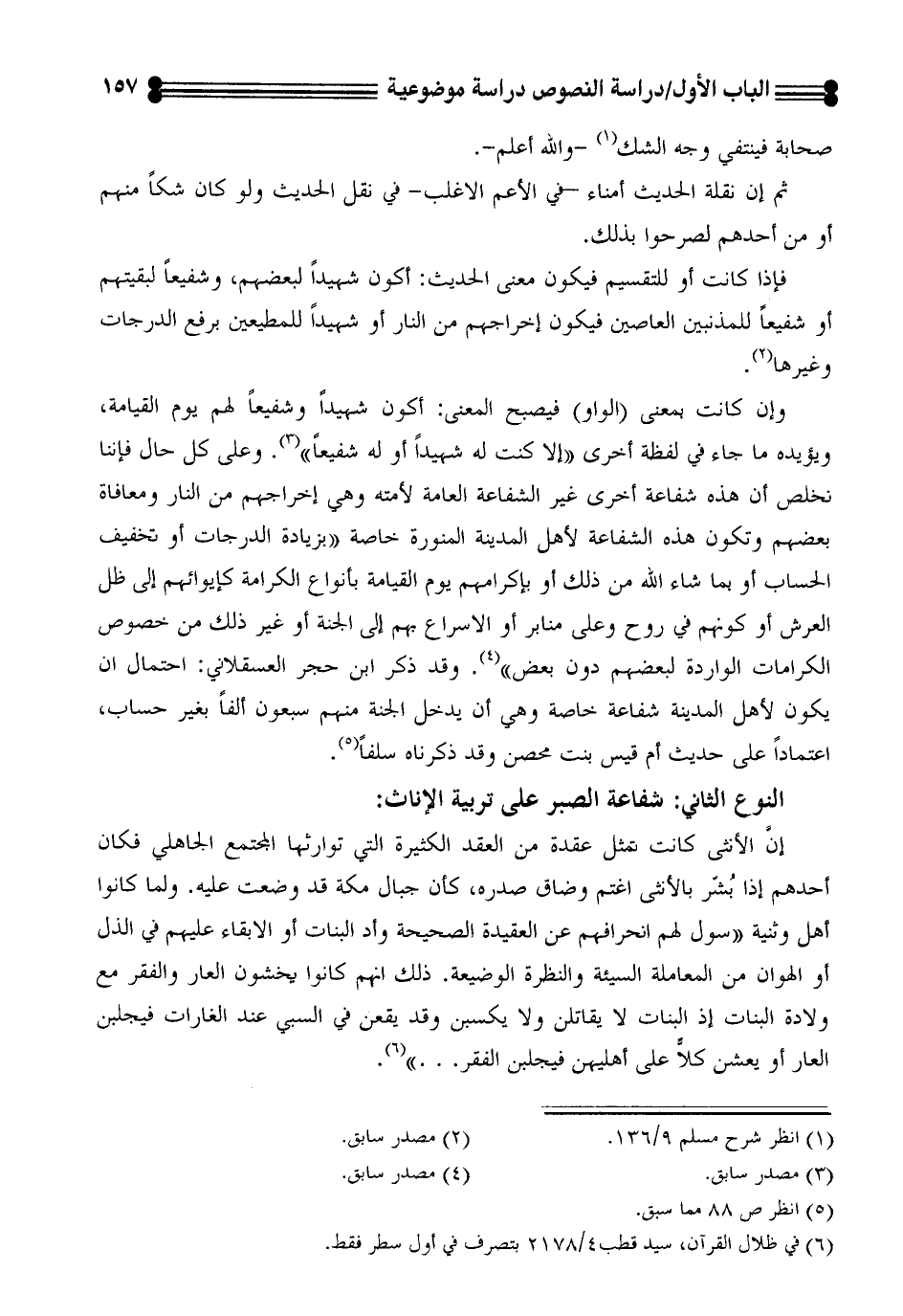 وإن كانت بمعنى (الواو) فيصبح المعنى: أكون شهيداً وشفيعاً لهم يوم القيامة، ويؤيده ما جاء في لفظة اخرى ((إلا كنت له شهيداً أو له شفيعاً)) (¬3). وعلى كل حال فإننا نخلص إن هذه الشفاعة أخرى غير الشفاعة العامة لأمته وهي اخراجهم من النار ومعافاة بعضهم وتكون هذه الشفاعة لاهل المدينة المنورة خاصة ((بزيادة الدرجات أو تخفيف الحساب او بما شاء الله من ذلك أو باكرامهم يوم القيامة بانواع الكرامة كايوائهم إلى ظل العرش أو كونهم في روح وعلى منابر أو الاسراع بهم إلى الجنة أو غير ذلك من خصوص الكرامات الواردة لبعضهم دون بعض)) (¬4).وقد ذكر إبن حجر العسقلاني: احتمال ان يكون لأهل المدينة شفاعة خاصة وهي أن يدخل الجنة منهم سبعون ألفاً بغير حساب، اعتماداً على حديث أم قيس بنت محصن وقد ذكرناه سلفاً (¬5).