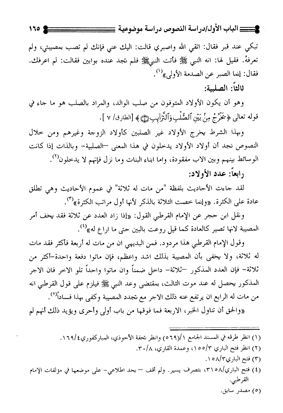 وقول الإمام القرطبي هذا مردود. فمن البديهي ان من مات له أربعة فاكثر فقد مات له ثلاثة، ولا يخفى بان المصيبة بذلك اشد واعظم، فان ماتوا دفعة واحدة-أكثر من ثلاثة- فان العدد المذكور -ثلاثة- داخل ضمناً وان ماتوا واحداً تلو الاخر فان الاجر المذكور يحصل له عند موت الثالث، بمقتضى وعد النبي - صلى الله عليه وسلم - فيلزم على قول القرطبي انه من مات له الرابع ان يرتفع عنه ذلك الاجر مع تجدد المصيبة وكفى بهذا فساداً (¬6).