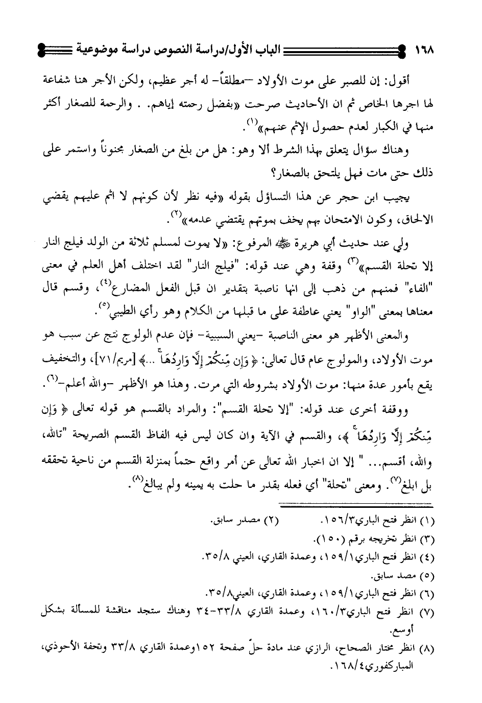 والمعنى الأظهر هو معنى الناصبة -يعني السببية- فان عدم الولوج نتج عن سبب هو موت الأولاد، والمولوج عام قال تعالى "وان منكم إلا واردها (¬6) .. ، والتخفيف يقع بامور عدة منها: موت الاولاد بشروطه التي مرت. وهذا هوالأظهر -والله أعلم- (¬7).