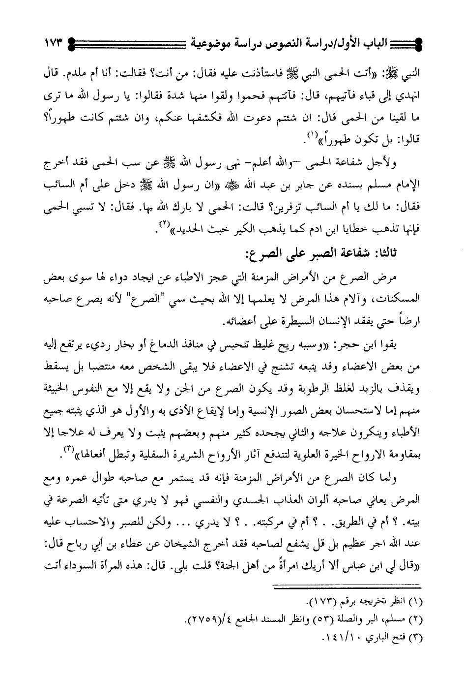 ولاجل شفاعة الحمى -والله اعلم- نهى رسول الله - صلى الله عليه وسلم - عن سب الحمى فقد أخرج الإمام مسلم بسنده عن جابر بن عبد الله - رضي الله عنه - ((ان رسول الله - صلى الله عليه وسلم - دخل على ام السائب فقال: مالك يا ام السائب تزفرين؟ قالت: الحمى لا بارك الله بها. فقال: لا تسبي الحمى فانها تذهب خطايا إبن ادم كما يذهب الكير خبث الحديد)) (¬2).