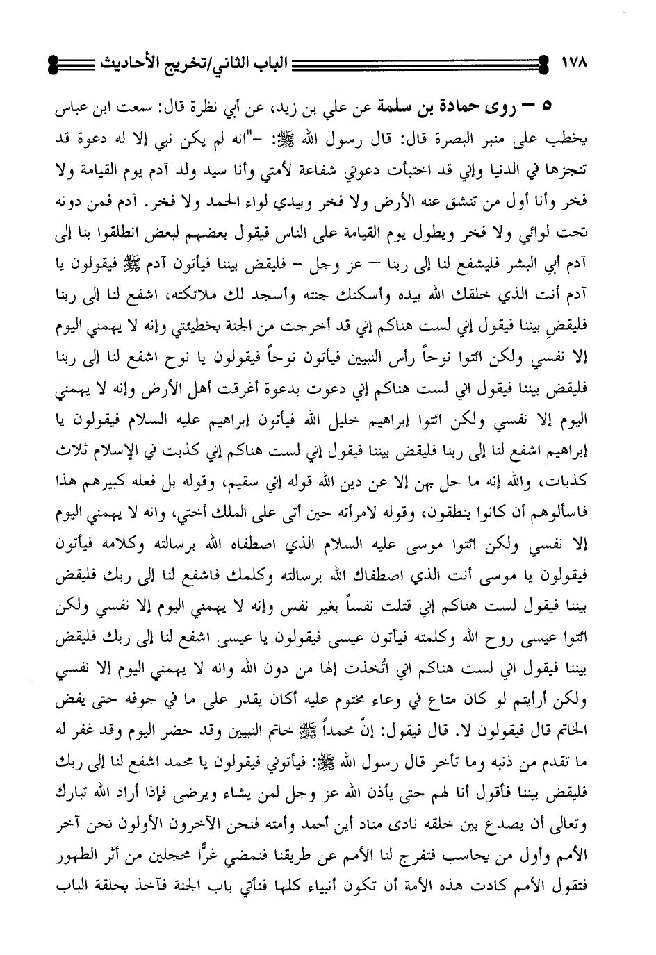 5 - روى حماد بن سلمة عن علي بن زيد، عن أبي نظرة قال: سمعت ابن عباس يخطب على منبر البصرة قال: قال رسول الله - صلى الله عليه وسلم -:-"انه لم يكن نبي إلا له دعوة قد تنجزها في الدنيا وإني قد اختبأت دعوتي شفاعة لأمتي وأنا سيد ولد آدم يوم القيامة ولا فخر وأنا أول من تنشق عنه الأرض ولا فخر وبيدي لواء الحمد ولا فخر. آدم فمن دونه تحت لوائي ولا فخر ويطول يوم القيامة على الناس فيقول بعضهم لبعض انطلقوا بنا إلى آدم أبي البشر فليشفع لنا إلى ربنا - عز وجل - فليقض بيننا فيأتون آدم - صلى الله عليه وسلم - فيقولون يا آدم أنت الذي خلقك الله بيده وأسكنك جنته وأسجد لك ملائكته، إشفع لنا إلى ربنا فليقضِ بيننا فيقول إني لست هناكم إني قد أخرجت من الجنة بخطيئتي وأنه لا يهمني اليوم إلا نفسي ولكن ائتوا نوحاً رأس النبيين فيأتون نوحاً فيقولون يا نوح اشفع لنا إلى ربنا فليقض بيننا فيقول اني لست هناكم إني دعوت بدعوة أغرقت أهل الأرض وأنه لا يهمني اليوم إلا نفسي ولكن ائتوا ابراهيم خليل الله فيأتون ابراهيم عليه السلام فيقولون يا ابراهيم اشفع لنا إلى ربنا فليقض بيننا فيقول إني لست هناكم إني كذبت في الإسلام ثلاث كذبات، والله أن حاول بهن إلا عن دين الله قوله اني سقيم، وقوله بل فعله كبيرهم هذا فاسألوهم أن كانوا ينطقون، وقوله لأمرأته حين اتى على الملك أُختي، وانه لا يهمني اليوم الا نفسي ولكن ائتوا موسى عليه السلام الذي اصطفاه الله برسالته وكلامه فيأتون فيقولون يا موسى انت الذي اصطفاك الله برسالته وكلمك فاشفع لنا إلى ربك فليقض بيننا فيقول لست هناكم انى قتلت نفساً بغير نفس وانه لا يهمني اليوم الا نفسي ولكن ائتوا عيسى روح الله وكلمته فيأتون عيسى فيقولون يا عيسى اشفع لنا إلى ربك فليقض بيننا فيقول اني لست هنا كم اني اتُخذت الها من دون الله وانه لا يهمني اليوم الا نفسي ولكن أرأيتم لو كان متاع في وعاء مختوم عليه أكان يقدر على ما في جوفه حتى يفض الخاتم قال فيقولون لا.
