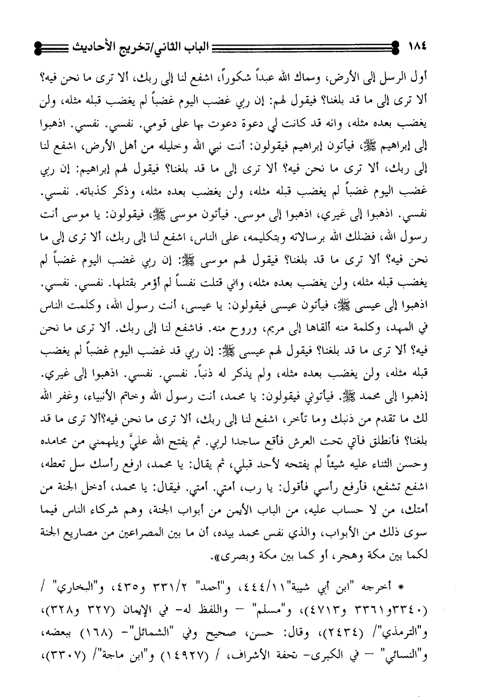 اول الرسل إلى الارض، وسماك الله عبداً شكوراً، اشفع لنا إلى ربك، الا ترى ما نحن فيه؟ الا ترى إلى ما قد بلغنا؟ فيقول لهم: أن ربي غضب اليوم غضباً لم يغضب قبله مثله، ولن يغضب بعده مثله، وانه قد كانت لي دعوة دعوت بها على قومي. نفسي. نفسي. اذهبو إلى ابراهيم - صلى الله عليه وسلم -، فيأتون ابراهيم فيقولون: انت نبي الله وخليله من أهل الارض، اشفع لنا إلى ربك، إلا ترى ما نحن فيه؟ الا ترى إلى ما قد بلغنا؟ فيقول لهم ابراهيم: أن ربي غضب اليوم غضباً لم يغضب قبله مثله، ولن يغضب بعده مثله، وذكر كذباته. نفسي. نفسي. اذهبوا إلى غيري، اذهبوا إلى موسى. فياتون موسى صلى الله عليه وسلم، فيقولون: يا موسى انت رسول الله، فضلك الله برسالاته وبتكليمه، على الناس، اشفع لنا إلى ربك، الا ترى إلى ما نحن فيه؟ إلى ترى ما قد بلغنا؟ فيقول لهم موسى - صلى الله عليه وسلم -: أن ربي غضب اليوم غضباً لم يغضب قبله مثله، ولن يغضب بعده مثله، واني قتلت نفساً لم أؤمر بقتلها. نفسي. نفسي.