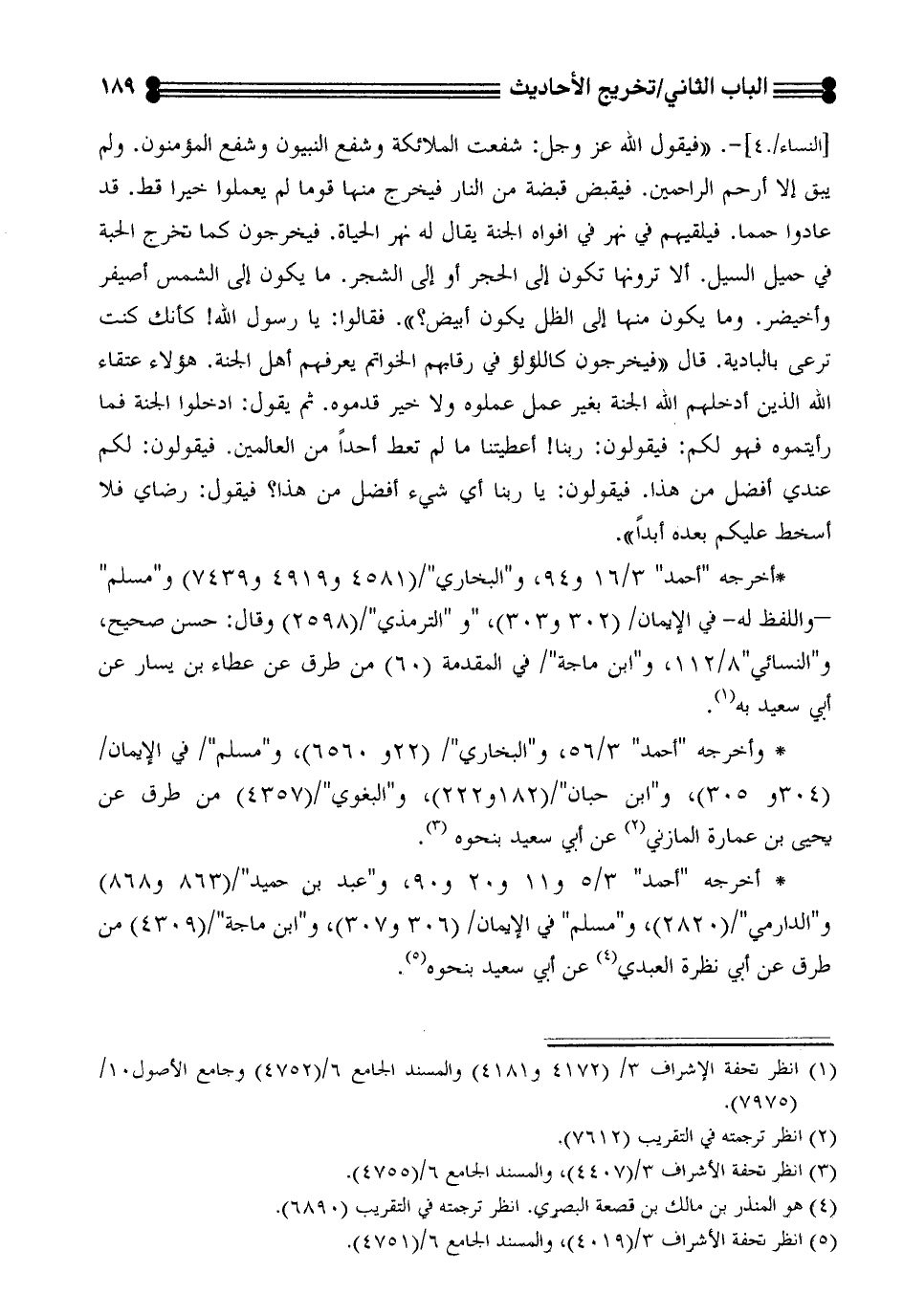 * وأخرجه "أحمد" 3/ 56، و "البخاري"/ (22و 6560)، و "مسلم"/ في الايمان/ (304و 305)، و"ابن حبان"/ (182و222)، و"البغوي"/ (4357).من طرق عن يحيى بن عمارة المازني (¬2) عن أبي سعيد بنحوه (¬3)