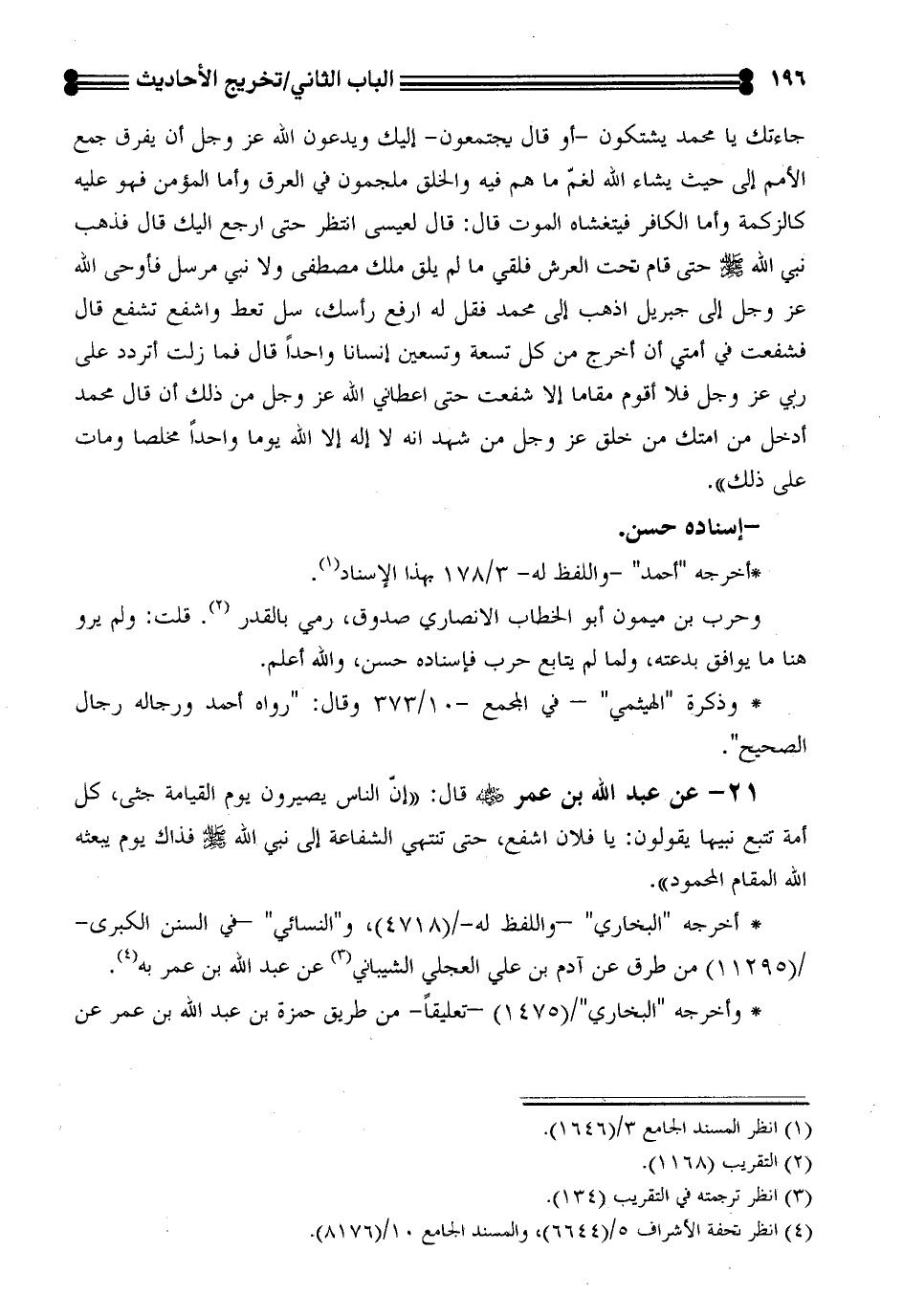 21 - عن عبد الله بن عمر - رضي الله عنه - قال: ((إنّ الناس يصيرون يوم القيامة جثا، كل امة تتبع نبيها يقولون: يا فلان إشفع، حتى تنتهي الشفاعة إلى نبي الله صلى الله عليه وسلم فذاك يوم يبعثه الله المقام المحمود)).