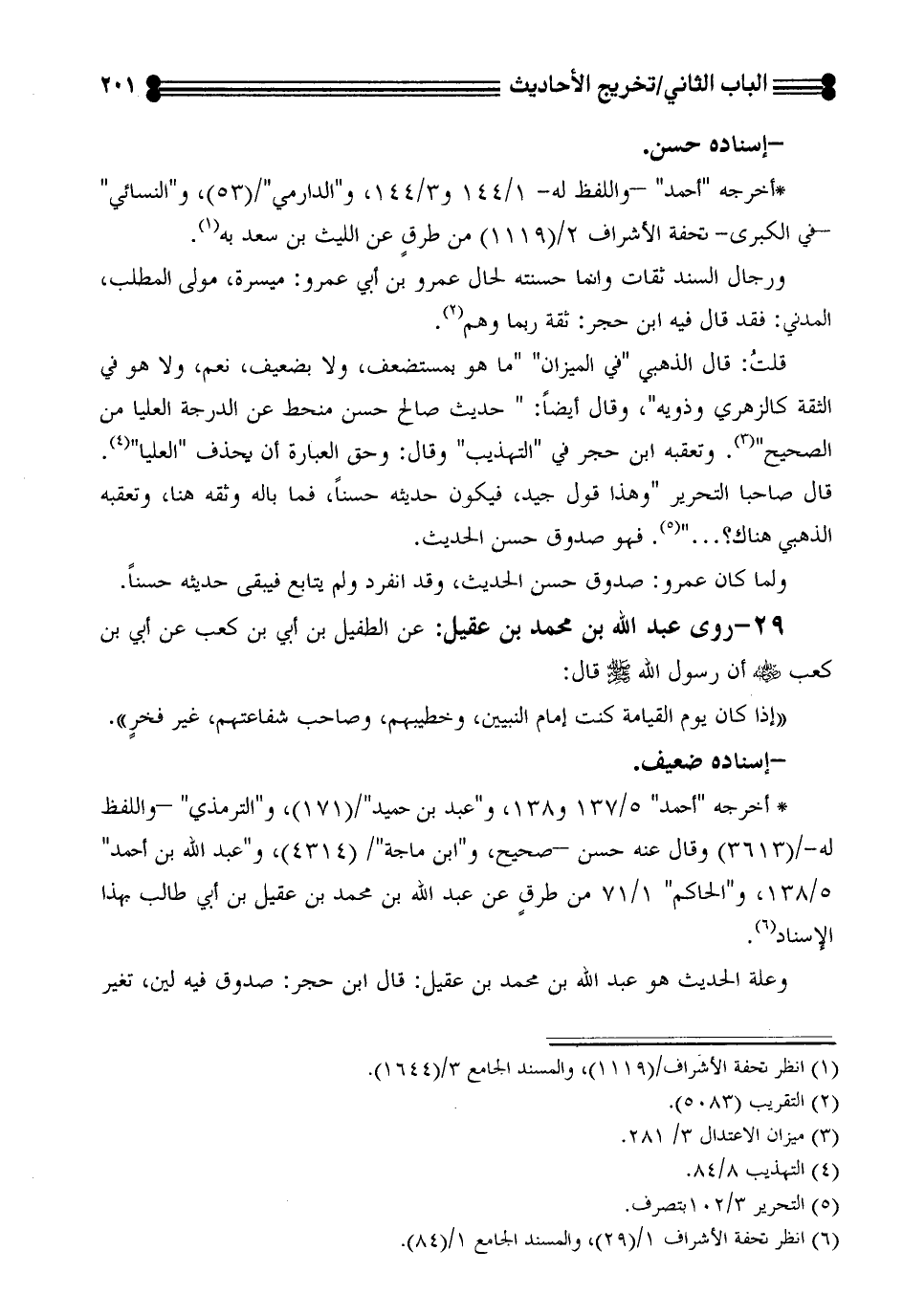* أخرجه "أحمد" 5/ 137 و138، و"عبد بن حميد"/ (171)، و "الترمذي" -والفظ له-/ (3613) وقال عنه حسن -صحيح، و "إبن ماجة"/ (4314)، و "عبد الله بن أحمد" 5/ 138، و "الحاكم" 1/ 71. من طرقٍ عن عبد الله إبن محمد بن عقيل بن أبي طالب بهذا الاسناد (¬6).