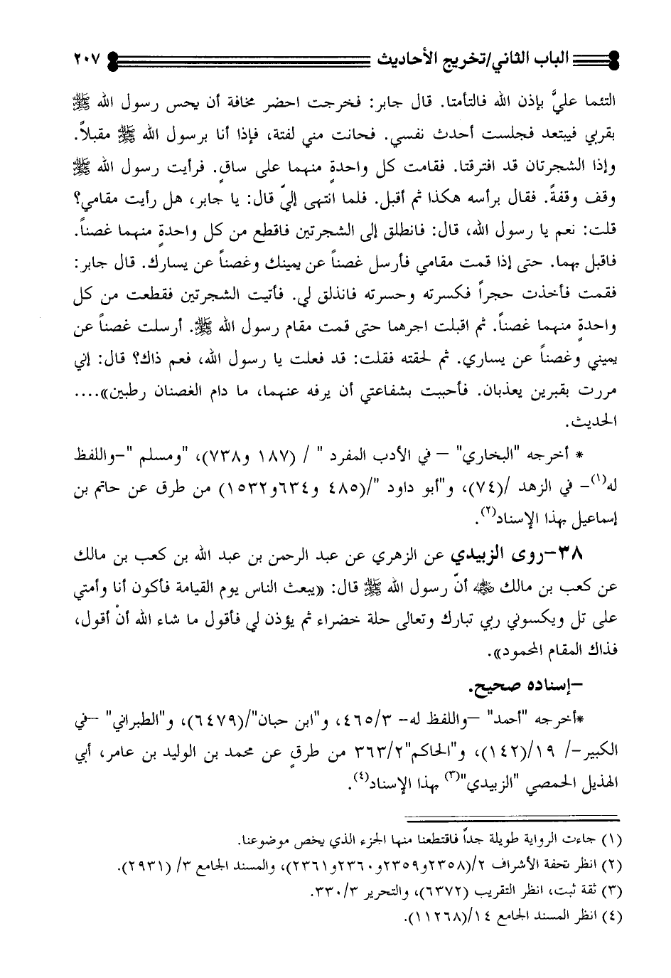إلتئما علي بإذن الله فالتأمتا. قال جابر: فخرجت احضر مخافة ان يحس رسول الله - صلى الله عليه وسلم - بقربي فيبتعد فجلست أحدث نفسي. فحانت مني لفتة، فإذا أنا برسول الله - صلى الله عليه وسلم - مقبلاً. وإذا الشجرتان قد افترقتا. فقامت كل واحدةٍ منهما على ساقٍ. فرأيت رسول الله - صلى الله عليه وسلم - وقف وقفةً. فقال برأسه هكذا ثم اقبل. فلما انتهى الي قال: يا جابر، هل رأيت مقامي؟ قلت: نعم. يا رسول الله، قال: فانطلق إلى الشجرتين فاقطع من كل واحدةٍ منهما غصناً. فاقبل بهما. حتى إذا قمت مقامي فأرسل غصناً عن يمينك وغصناً عن يسارك. قال جابر: فقمت فأخذت حجراً فكسرته وحسرته فانذلق لي.