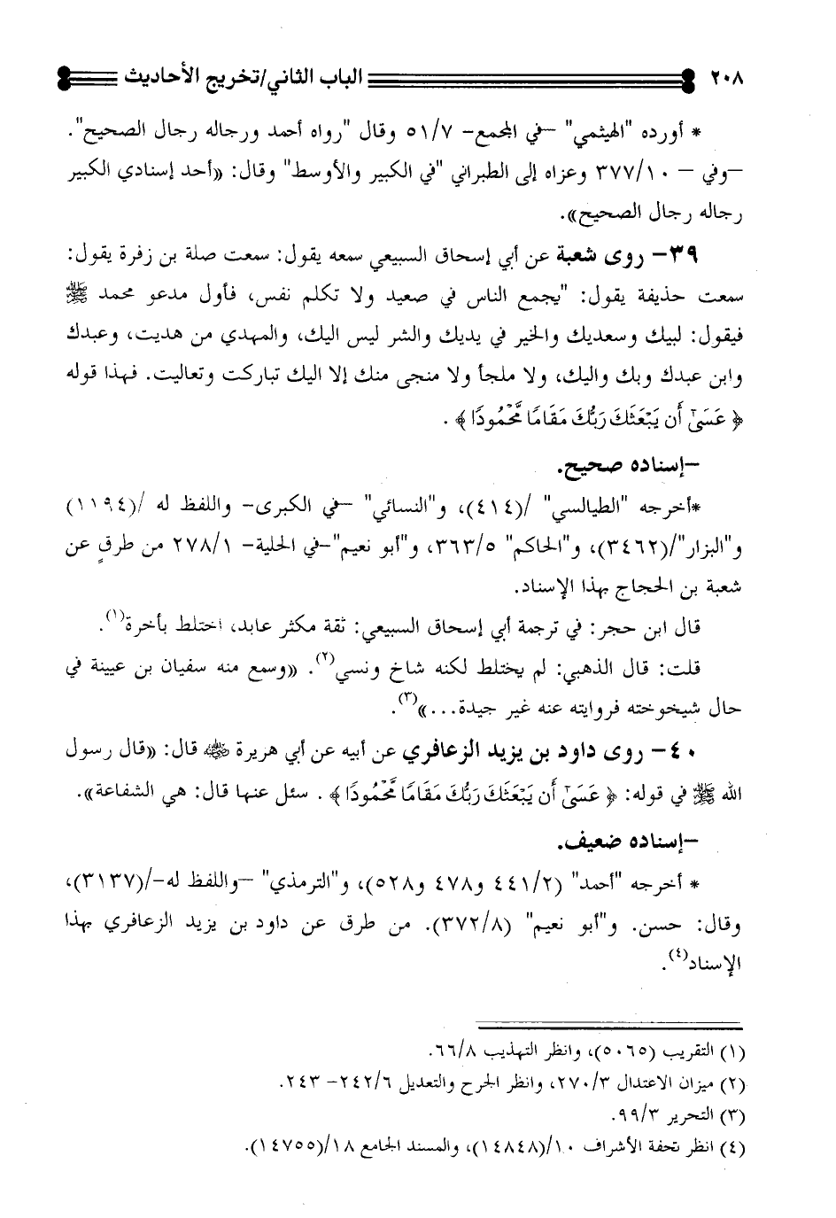 39 - روى شعبة عن أبي اسحق السبيعي سمعه يقول: سمعت صله بن زفرة يقول: سمعت حذيفة يقول:"يجمع الناس في صعيد ولا تكلم نفس، فأول مدعو محمد - صلى الله عليه وسلم - فيقول: لبيك وسعديك والخير في يديك والشر ليس اليك، والمهدي من هديت، وعبدك وإبن عبدك وبك واليك، ولا ملجأ ولا منجى منك إلا اليك تباركت وتعاليت. فهذا قوله "عسى ان يبعثك ربك مقاماً محموداً.