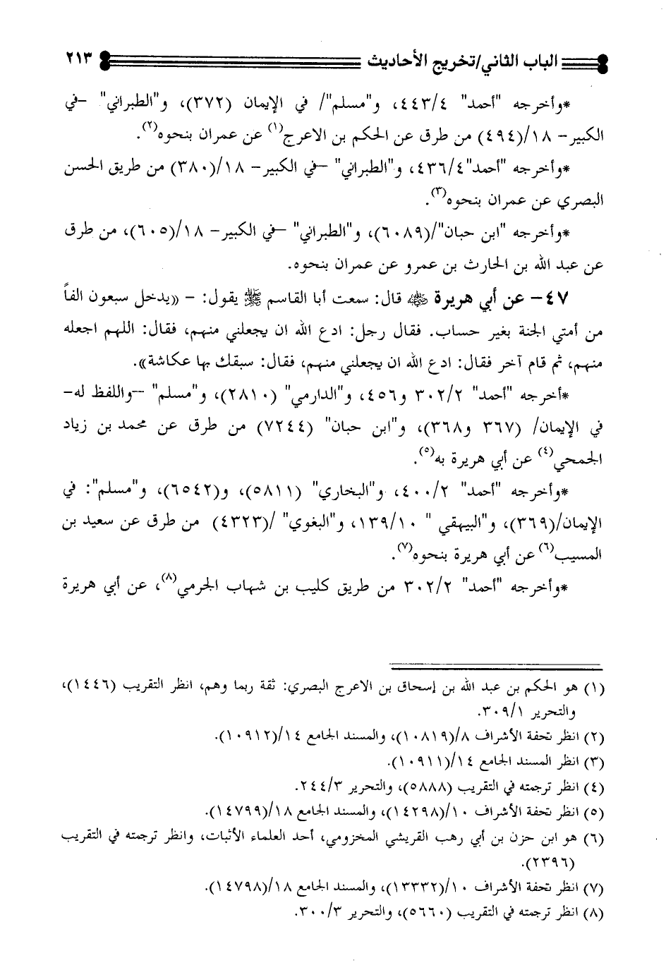 *وأخرجه "أحمد" 4/ 443، و "مسلم"/ في الإيمان (372)، و "الطبراني" -في الكبير- 18/ (494). من طرق عن الحكم بن الاعرج (¬1) عن عمران بنحوه (¬2).