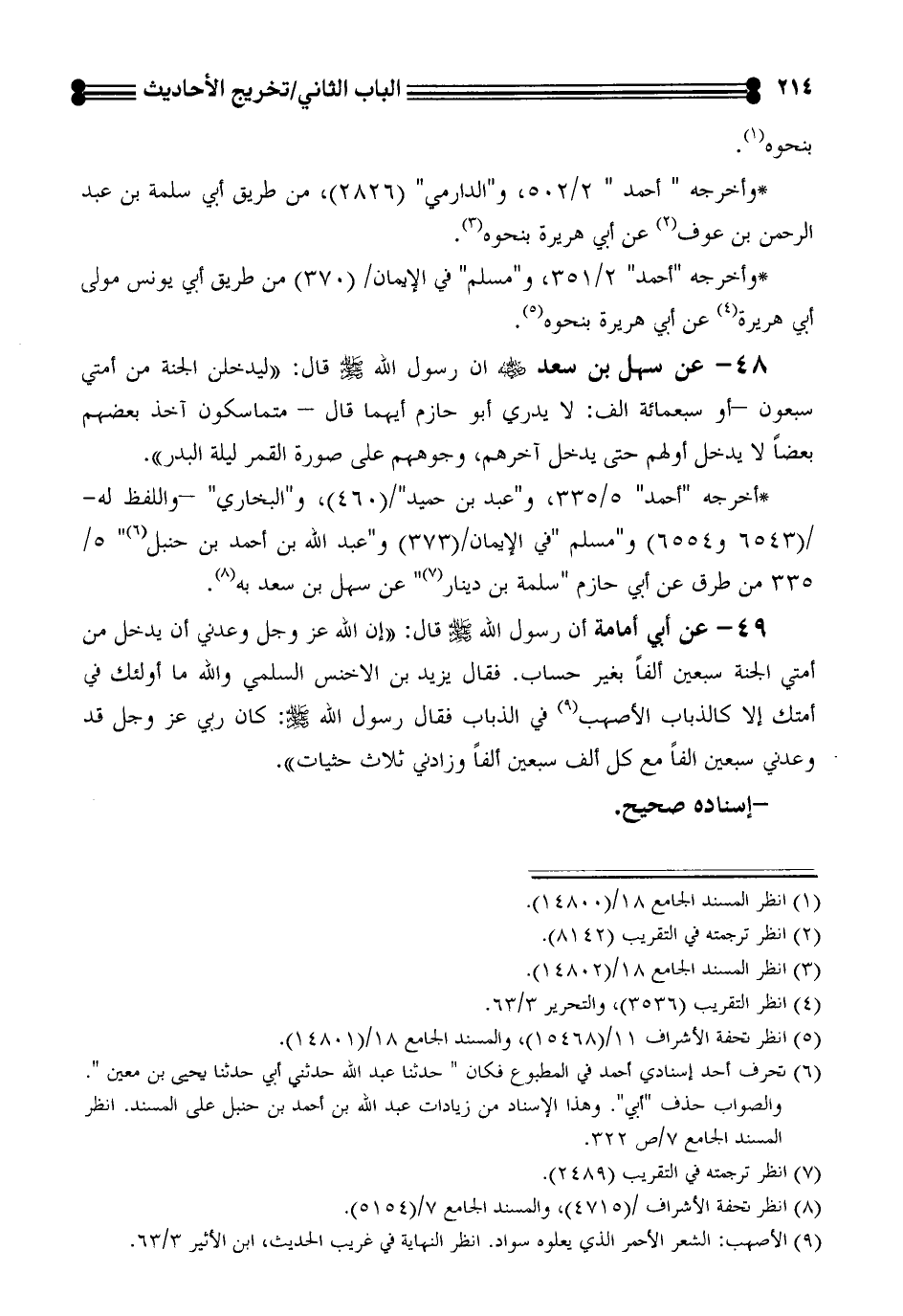 49 - عن أبي أمامة أن رسول الله - صلى الله عليه وسلم - قال: ((إن الله عز وجل وعدني أن يدخل من أمتي الجنة سبعين ألفاً بغير حساب. فقال يزيد بن الاخنس السلمي والله ما أولئك في امتك إلا كالذباب الأصهب (¬9) في الذباب فقال رسول الله - صلى الله عليه وسلم -: كان ربي عز وجل قد وعدني سبعين الفاً مع كل ألف سبعين ألفاً وزادني ثلاث حثيات)).