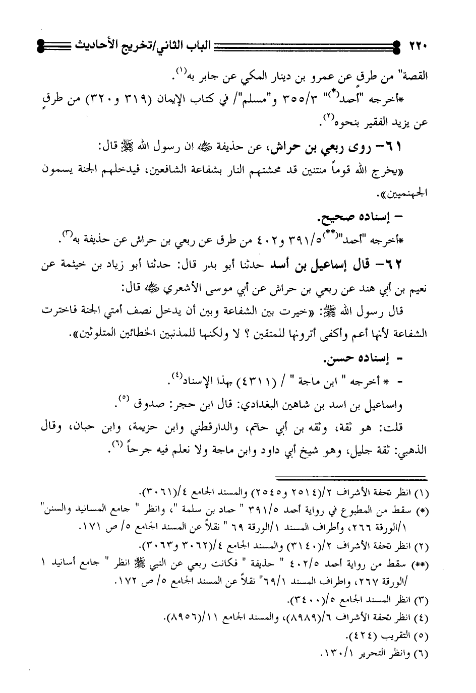 62 - قال اسماعيل بن أسد حدثنا أبو بدر قال: حدثنا أبو زياد بن خيثمة عن نعيم بن أبي هند عن ربعي بن حراش عن أبي موسى الاشعري - رضي الله عنه - قال: