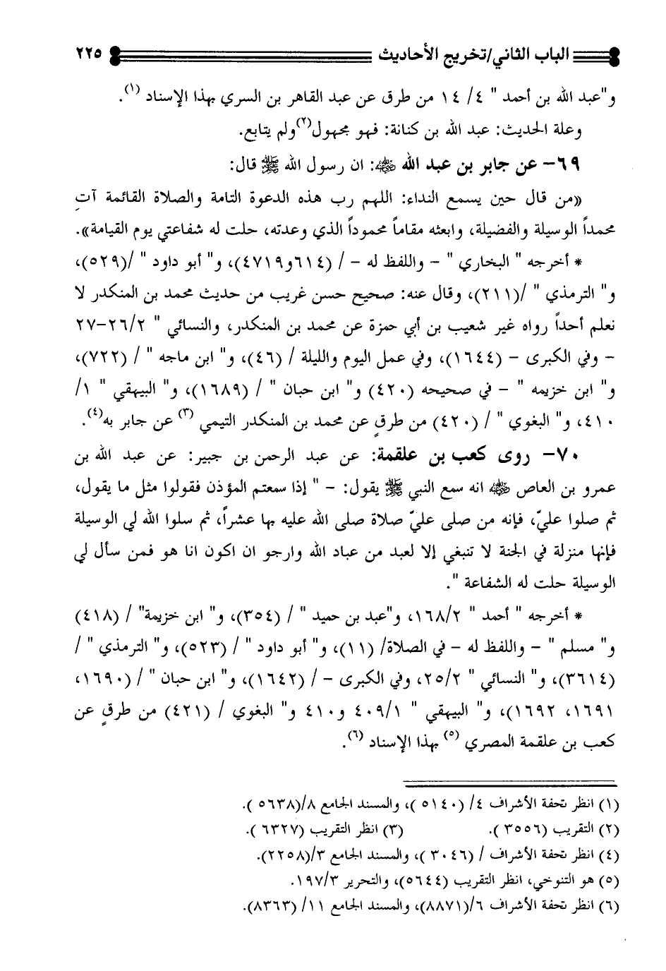 70 - روى كعب بن علقمة: عن عبد الرحمن بن جبير: عن عبد الله بن عمرو بن العاص - رضي الله عنه - انه سمع النبي - صلى الله عليه وسلم - يقول:- " اذا سمعتم المؤذن فقولوا مثل مايقول، ثم صلوا علي، فانه من صلى علي صلاة صلى الله عليه بها عشراً، ثم سلوا الله لي الوسيلة فانها منزلة في الجنة لاتنبغي الا لعبد من عباد الله وارجو ان اكون انا هو فمن سأل لي الوسيلة حلت له الشفاعة "