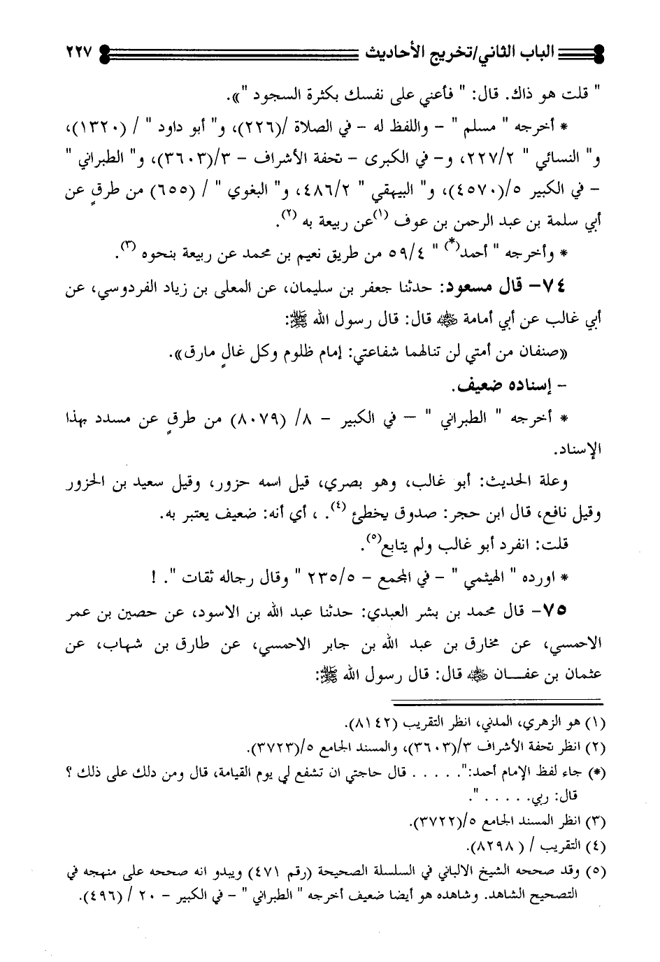 (¬5) وقد صححه الشيخ الالباني في السلسلة الصحيحة (رقم 471) ويبدو انه صححه على منهجه في التصحيح الشاهد. وشاهده هو ايضاً ضعيف أخرجه " الطبراني " - في الكبير - 20 / (496).