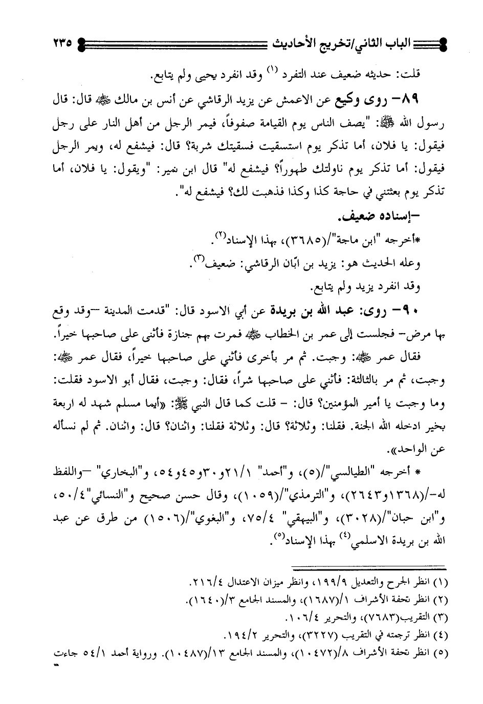 89 - روى وكيع عن الاعمش عن يزيد الرقاشي عن انس بن مالك - رضي الله عنه - قال: قال رسول الله - صلى الله عليه وسلم -: "يصف الناس يوم القيامة صفوفاً، فيمر الرجل من أهل النار على رجل فيقول: يا فلان، اما تذكر يوم استسقيت فسقيتك شربه؟ قال: فيشفع له، ويمر الرجل فيقول: أما تذكر يوم ناولتك طهوراً؟ فيشفع له" قال إبن نمير: "ويقول: يا فلان، اما تذكر يوم بعثتني في حاجة كذا وكذا فذهبت لك؟ فيشفع له".