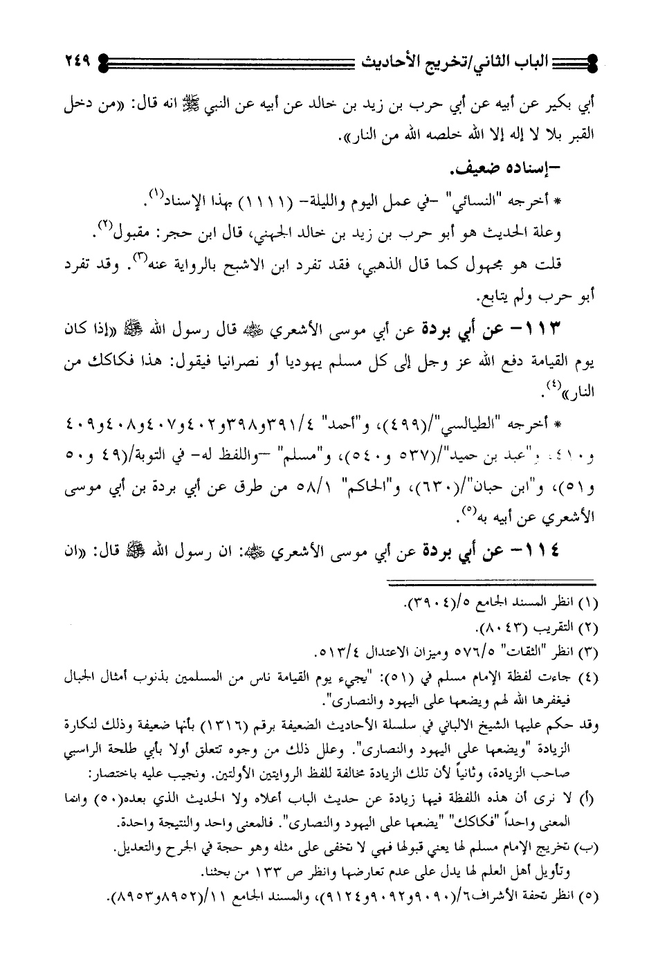 113 - عن أبي بردة عن أبي موسى الاشعري - رضي الله عنه - قال رسول الله - صلى الله عليه وسلم - ((إذا كان يوم القيامة دفع الله عز وجل إلى كل مسلم يهوديا أو نصرانيا فيقول: هذا فكاكك من النار)) (¬4).