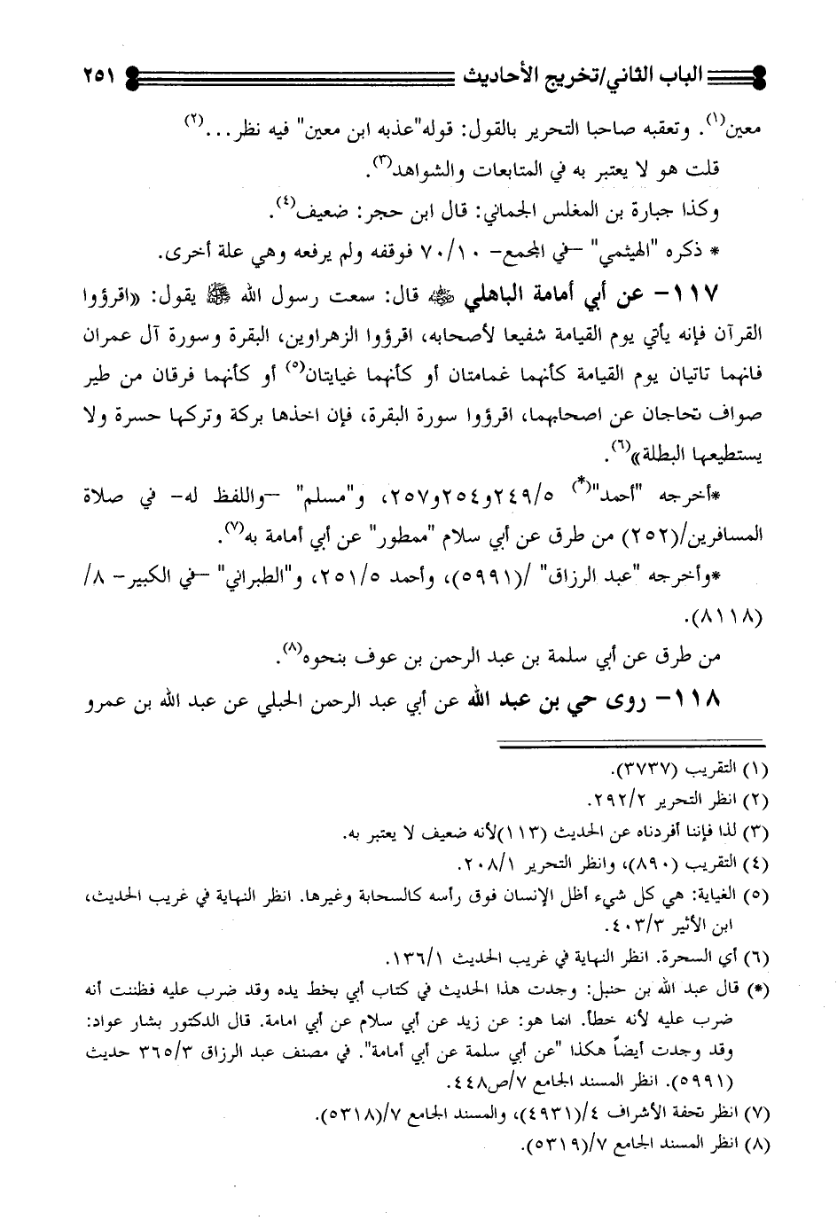 117 - عن أبي امامة الباهلي - رضي الله عنه - قال: سمعت رسول - صلى الله عليه وسلم - يقول: ((اقرؤا القرآن فانه ياتي يوم القيامة شفيعا لاصحابه، اقرؤا الزهراوين، البقرة وسورة آل عمران فانهما تاتيان يوم القيامة كأنهما غمامتان أو كأنهما غيايتان (¬5) أو كأنهما فرقان من طير صواف تحاجان عن اصحابهما، اقرؤا سورة البقرة، فان اخذها بركة وتركها حسرة ولا يستطيعها البطلة)) (¬6).