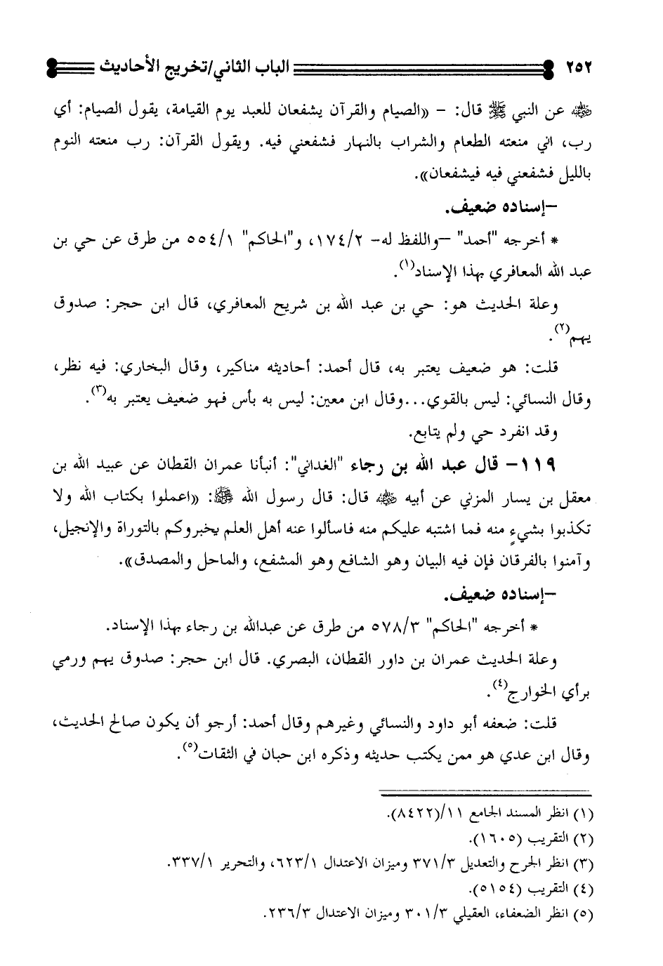 119 - قال عبد الله إبن رجاء "الغداني": أنبأنا عمران القطان عن عبيد الله بن معقل بن يسار المزني عن أبيه - رضي الله عنه - قال: قال رسول الله - صلى الله عليه وسلم -: ((إعملوا بكتاب الله ولا تكذبوا بشيءٍ منه فما اشتبه عليكم منه فاسألوا عنه أهل العلم يخبروكم بالتوراة والإنجيل، وآمنوا بالفرقان فإن فيه البيان وهو الشافع وهو المشفع، والماحل والمصدق)).
